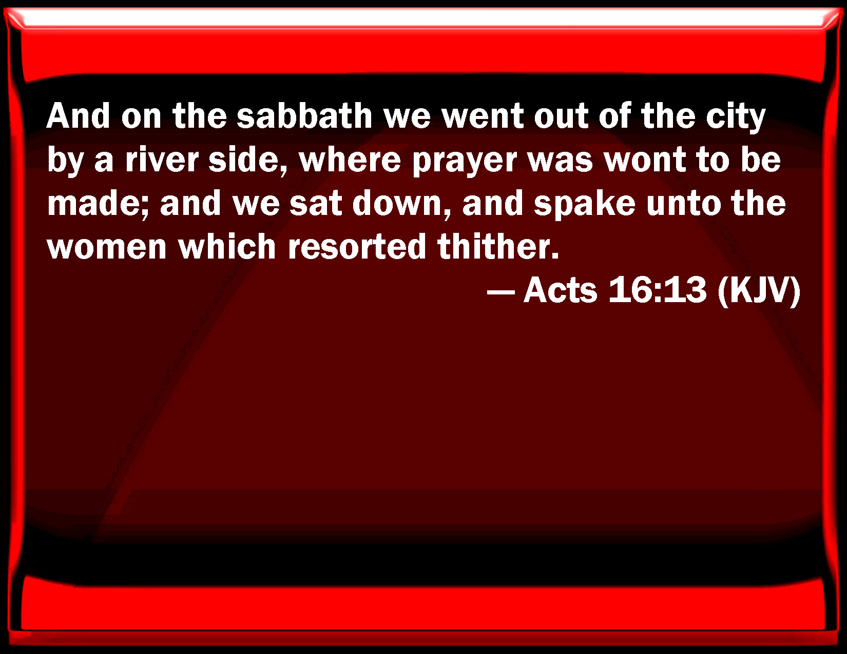 Bible Verse Slide Acts 16:13 And on the sabbath we went out of the city by a river side, where prayer was wont to be made; and we sat down, and spoke to the women which resorted thither. KJV: And on the sabbath we went out of the city by a river side, where prayer was wont to be made; and we sat down, and spake unto the women which resorted thither. DRB: And upon the sabbath day, we went forth without the gate by a river side, where it seemed that there was prayer; and sitting down, we spoke to the women that were assembled. DBT: And on the sabbath day we went outside the gate by the river, where it was the custom for prayer to be, and we sat down and spoke to the women who had assembled. ERV: And on the sabbath day we went forth without the gate by a river side, where we supposed there was a place of prayer; and we sat down, and spake unto the women which were come together. WBT: And on the sabbath we went out of the city by a river side, where prayer was wont to be made; and we sat down, and spoke to the women who resorted thither. WEB: On the Sabbath day we went forth outside of the city by a riverside, where we supposed there was a place of prayer, and we sat down, and spoke to the women who had come together. YLT: on the sabbath-day also we went forth outside of the city, by a river, where there used to be prayer, and having sat down, we were speaking to the women who came together,Links Acts 16:13 NIV • Acts 16:13 NLT • Acts 16:13 ESV • Acts 16:13 NASB • Acts 16:13 KJV • Acts 16:13 Interlinear • Acts 16:13 Commentaries • Acts 16:13 Parallel Texts • Acts 16:13 Bible Apps • Acts 16:13 Parallel • Bible Hub |