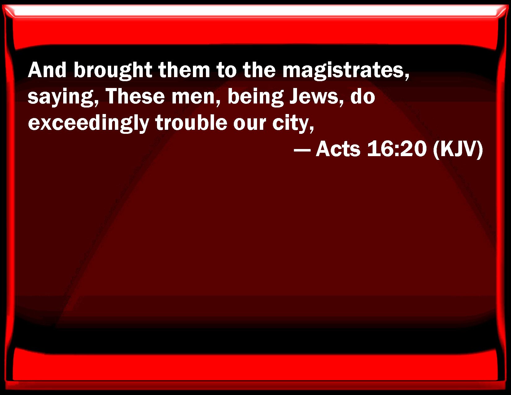 Bible Verse Slide Acts 16:20 And brought them to the magistrates, saying, These men, being Jews, do exceedingly trouble our city, KJV: And brought them to the magistrates, saying, These men, being Jews, do exceedingly trouble our city, DRB: And presenting them to the magistrates, they said: These men disturb our city, being Jews; DBT: and having brought them up to the praetors, said, These men utterly trouble our city, being Jews, ERV: and when they had brought them unto the magistrates, they said, These men, being Jews, do exceedingly trouble our city, WBT: And brought them to the magistrates, saying, These men, being Jews, do exceedingly trouble our city, WEB: When they had brought them to the magistrates, they said, "These men, being Jews, are agitating our city, YLT: and having brought them to the magistrates, they said, 'These men do exceedingly trouble our city, being Jews;Links Acts 16:20 NIV • Acts 16:20 NLT • Acts 16:20 ESV • Acts 16:20 NASB • Acts 16:20 KJV • Acts 16:20 Interlinear • Acts 16:20 Commentaries • Acts 16:20 Parallel Texts • Acts 16:20 Bible Apps • Acts 16:20 Parallel • Bible Hub |