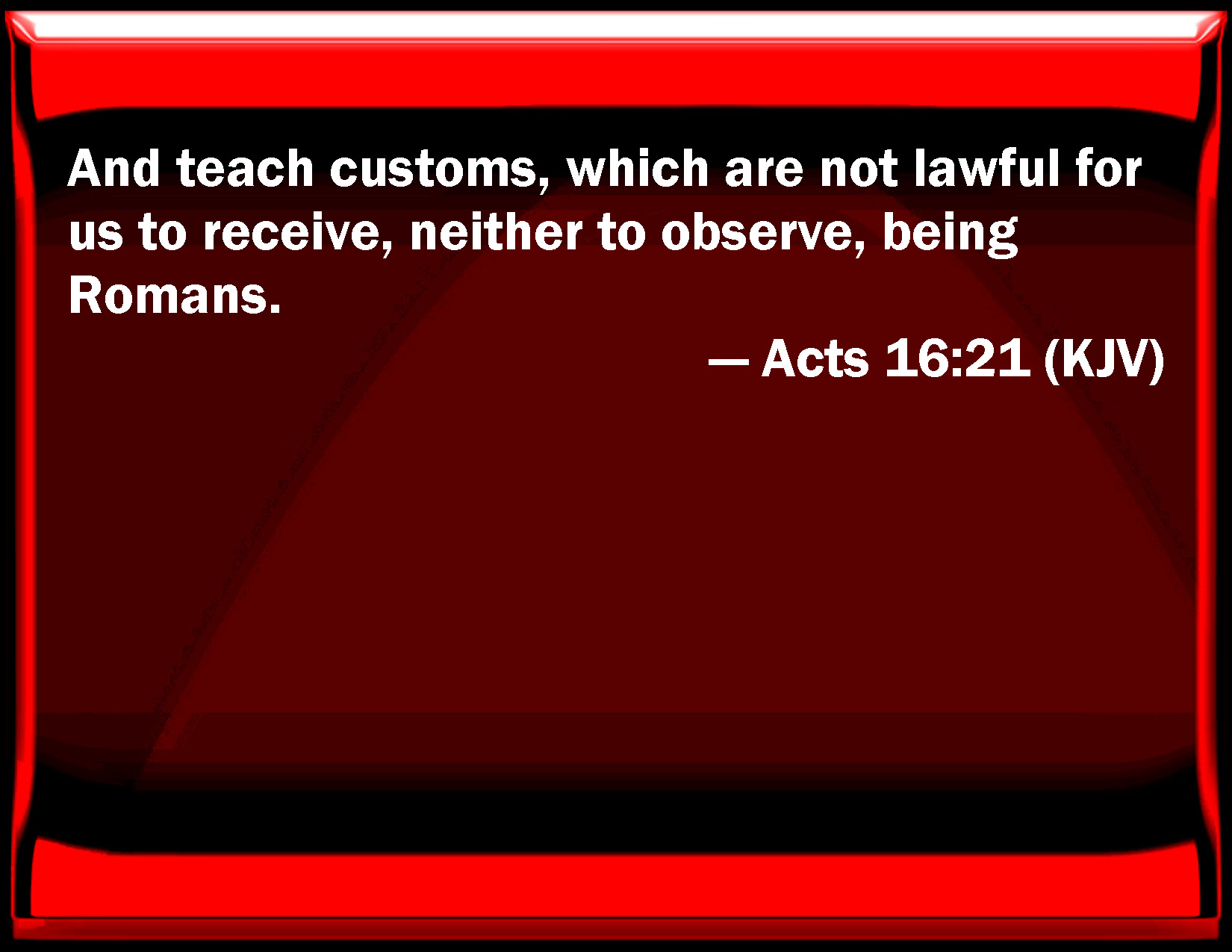 Bible Verse Slide Acts 16:21 And teach customs, which are not lawful for us to receive, neither to observe, being Romans. KJV: And teach customs, which are not lawful for us to receive, neither to observe, being Romans. DRB: And preach a fashion which it is not lawful for us to receive nor observe, being Romans. DBT: and announce customs which it is not lawful for us to receive nor practise, being Romans. ERV: and set forth customs which it is not lawful for us to receive, or to observe, being Romans. WBT: And teach customs which are not lawful for us to receive, neither to observe, being Romans. WEB: and set forth customs which it is not lawful for us to accept or to observe, being Romans." YLT: and they proclaim customs that are not lawful for us to receive nor to do, being Romans.'Links Acts 16:21 NIV • Acts 16:21 NLT • Acts 16:21 ESV • Acts 16:21 NASB • Acts 16:21 KJV • Acts 16:21 Interlinear • Acts 16:21 Commentaries • Acts 16:21 Parallel Texts • Acts 16:21 Bible Apps • Acts 16:21 Parallel • Bible Hub |