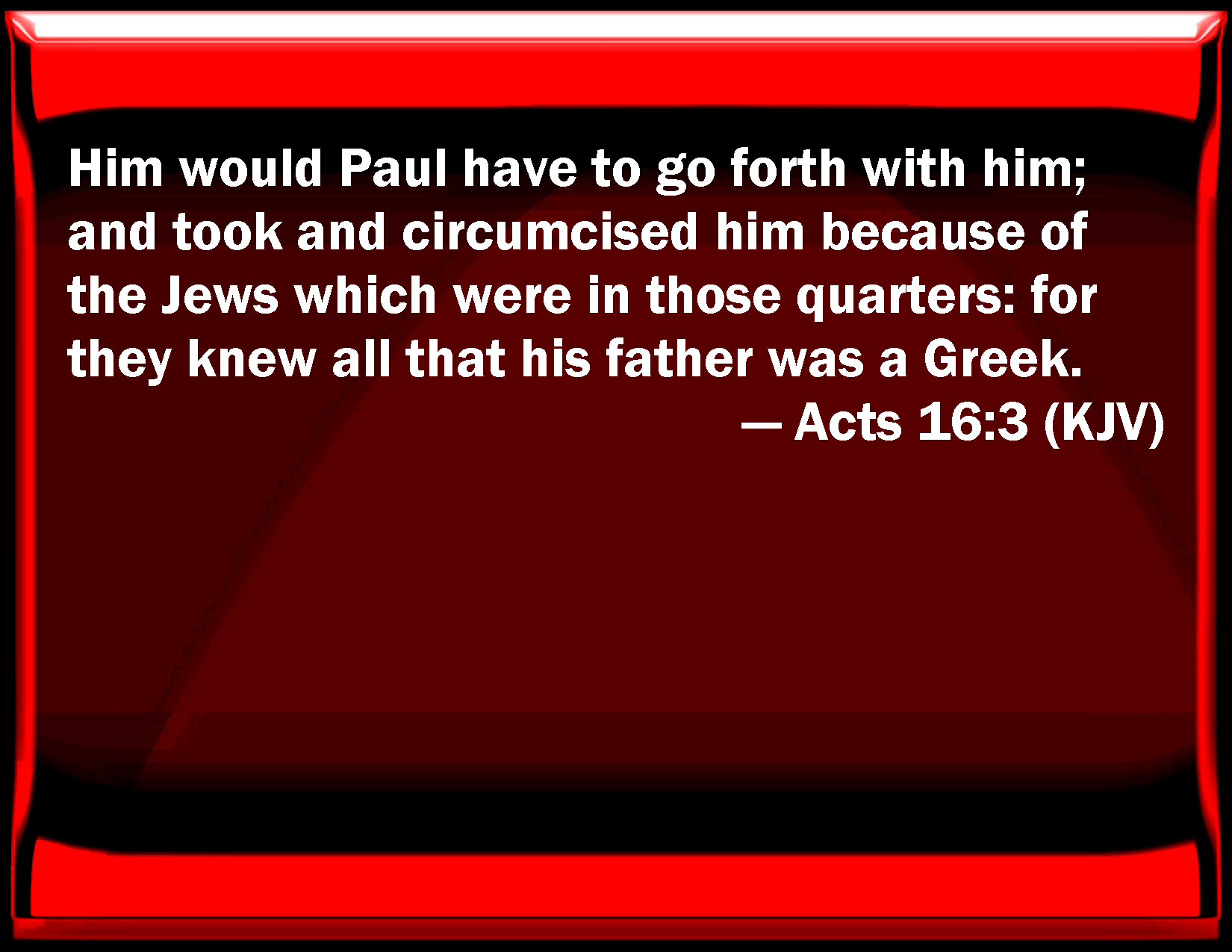 Acts 16:3 Him would Paul have to go forth with him; and took and circumcised him because of the Jews which were in those quarters: for they knew all that his father was a Greek.