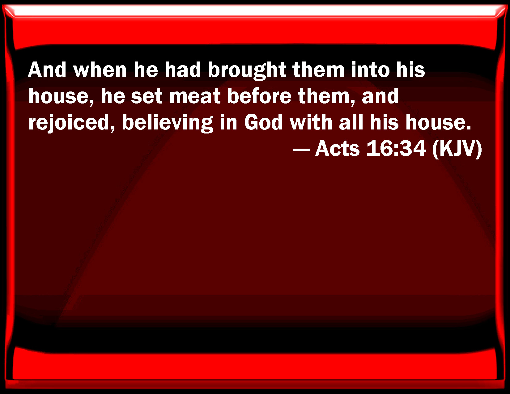 Bible Verse Slide Acts 16:34 And when he had brought them into his house, he set meat before them, and rejoiced, believing in God with all his house. KJV: And when he had brought them into his house, he set meat before them, and rejoiced, believing in God with all his house. DRB: And when he had brought them into his own house, he laid the table for them, and rejoiced with all his house, believing God. DBT: And having brought them into his house he laid the table for them, and rejoiced with all his house, having believed in God. ERV: And he brought them up into his house, and set meat before them, and rejoiced greatly, with all his house, having believed in God. WBT: And when he had brought them into his house, he set food before them, and rejoiced, believing in God with all his house. WEB: He brought them up into his house, and set food before them, and rejoiced greatly, with all his household, having believed in God. YLT: having brought them also into his house, he set food before them, and was glad with all the household, he having believed in God.Links Acts 16:34 NIV • Acts 16:34 NLT • Acts 16:34 ESV • Acts 16:34 NASB • Acts 16:34 KJV • Acts 16:34 Interlinear • Acts 16:34 Commentaries • Acts 16:34 Parallel Texts • Acts 16:34 Bible Apps • Acts 16:34 Parallel • Bible Hub |