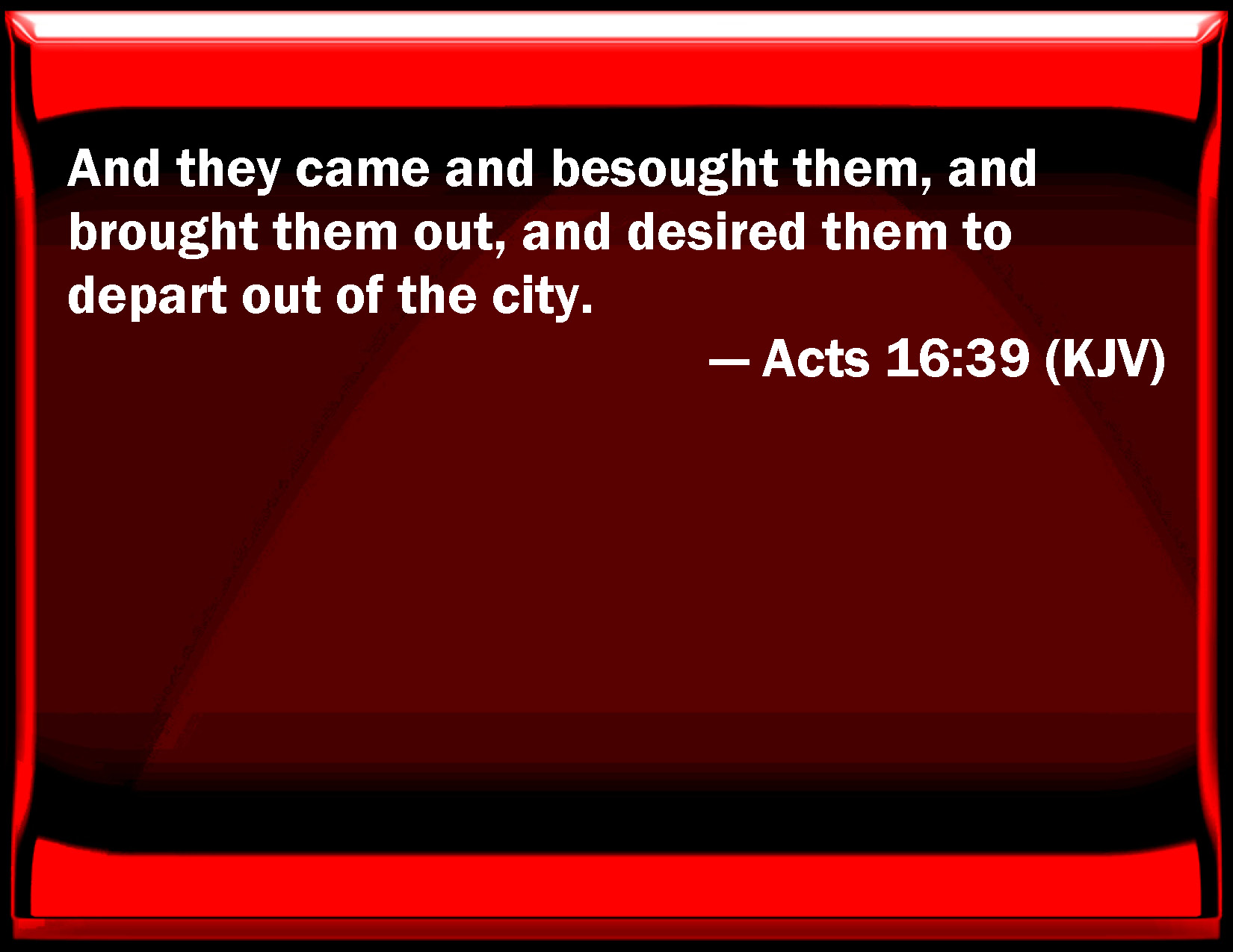 Bible Verse Slide Acts 16:39 And they came and sought them, and brought them out, and desired them to depart out of the city. KJV: And they came and besought them, and brought them out, and desired them to depart out of the city. DRB: And coming, they besought them; and bringing them out, they desired them to depart out of the city. DBT: And they came and besought them, and having brought them out, asked them to go out of the city. ERV: and they came and besought them; and when they had brought them out, they asked them to go away from the city. WBT: And they came and besought them, and brought them out, and desired them to depart out of the city. WEB: and they came and begged them. When they had brought them out, they asked them to depart from the city. YLT: and having come, they besought them, and having brought them forth, they were asking them to go forth from the city;Links Acts 16:39 NIV • Acts 16:39 NLT • Acts 16:39 ESV • Acts 16:39 NASB • Acts 16:39 KJV • Acts 16:39 Interlinear • Acts 16:39 Commentaries • Acts 16:39 Parallel Texts • Acts 16:39 Bible Apps • Acts 16:39 Parallel • Bible Hub |