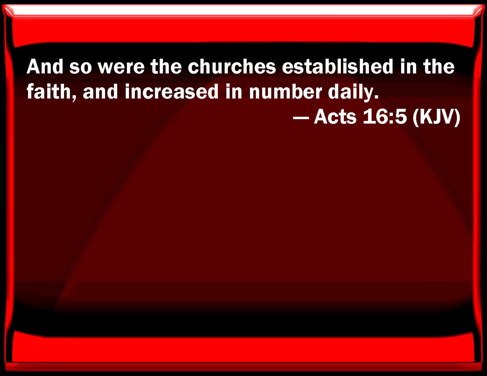 Bible Verse Slide Acts 16:5 And so were the churches established in the faith, and increased in number daily. KJV: And so were the churches established in the faith, and increased in number daily. DRB: And the churches were confirmed in faith, and increased in number daily. DBT: The assemblies therefore were confirmed in the faith, and increased in number every day. ERV: So the churches were strengthened in the faith, and increased in number daily. WBT: And so were the churches established in the faith, and increased in number daily. WEB: So the assemblies were strengthened in the faith, and increased in number daily. YLT: then, indeed, were the assemblies established in the faith, and were abounding in number every day;Links Acts 16:5 NIV • Acts 16:5 NLT • Acts 16:5 ESV • Acts 16:5 NASB • Acts 16:5 KJV • Acts 16:5 Interlinear • Acts 16:5 Commentaries • Acts 16:5 Parallel Texts • Acts 16:5 Bible Apps • Acts 16:5 Parallel • Bible Hub |