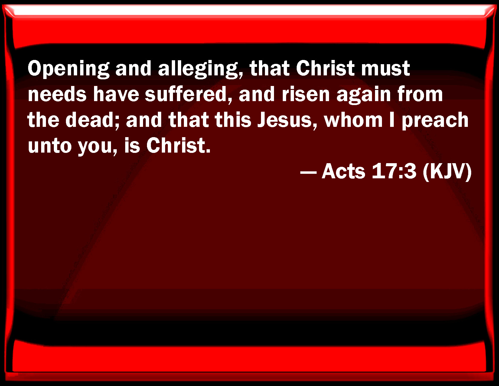 Bible Verse Slide Acts 17:3 Opening and alleging, that Christ must needs have suffered, and risen again from the dead; and that this Jesus, whom I preach to you, is Christ. KJV: Opening and alleging, that Christ must needs have suffered, and risen again from the dead; and that this Jesus, whom I preach unto you, is Christ. DRB: Declaring and insinuating that the Christ was to suffer, and to rise again from the dead; and that this is Jesus Christ, whom I preach to you. DBT: opening and laying down that the Christ must have suffered and risen up from among the dead, and that this is the Christ, Jesus whom I announce to you. ERV: opening and alleging, that it behoved the Christ to suffer, and to rise again from the dead; and that this Jesus, whom, said he, I proclaim unto you, is the Christ. WBT: Opening and alledging, that it was needful that Christ should suffer, and rise again from the dead; and that this Jesus, whom I preach to you, is Christ. WEB: explaining and demonstrating that the Christ had to suffer and rise again from the dead, and saying, "This Jesus, whom I proclaim to you, is the Christ." YLT: opening and alleging, 'That the Christ it behoved to suffer, and to rise again out of the dead, and that this is the Christ — Jesus whom I proclaim to you.'Links Acts 17:3 NIV • Acts 17:3 NLT • Acts 17:3 ESV • Acts 17:3 NASB • Acts 17:3 KJV • Acts 17:3 Interlinear • Acts 17:3 Commentaries • Acts 17:3 Parallel Texts • Acts 17:3 Bible Apps • Acts 17:3 Parallel • Bible Hub |