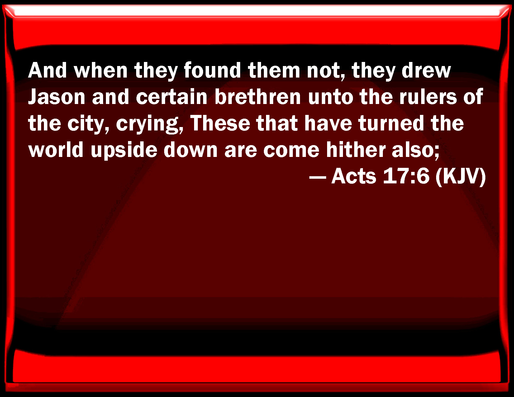 Bible Verse Slide Acts 17:6 And when they found them not, they drew Jason and certain brothers to the rulers of the city, crying, These that have turned the world upside down are come here also; KJV: And when they found them not, they drew Jason and certain brethren unto the rulers of the city, crying, These that have turned the world upside down are come hither also; DRB: And not finding them, they drew Jason and certain brethren to the rulers of the city, crying: They that set the city in an uproar, are come hither also; DBT: and not having found them, dragged Jason and certain brethren before the politarchs, crying out, These men that have set the world in tumult, are come here also, ERV: And when they found them not, they dragged Jason and certain brethren before the rulers of the city, crying, These that have turned the world upside down are come hither also; WBT: And when they found them not, they drew Jason and certain brethren to the rulers of the city, crying, These that have turned the world upside down, have come hither also; WEB: When they didn't find them, they dragged Jason and certain brothers before the rulers of the city, crying, "These who have turned the world upside down have come here also, YLT: and not having found them, they drew Jason and certain brethren unto the city rulers, calling aloud — 'These, having put the world in commotion, are also here present,Links Acts 17:6 NIV • Acts 17:6 NLT • Acts 17:6 ESV • Acts 17:6 NASB • Acts 17:6 KJV • Acts 17:6 Interlinear • Acts 17:6 Commentaries • Acts 17:6 Parallel Texts • Acts 17:6 Bible Apps • Acts 17:6 Parallel • Bible Hub |