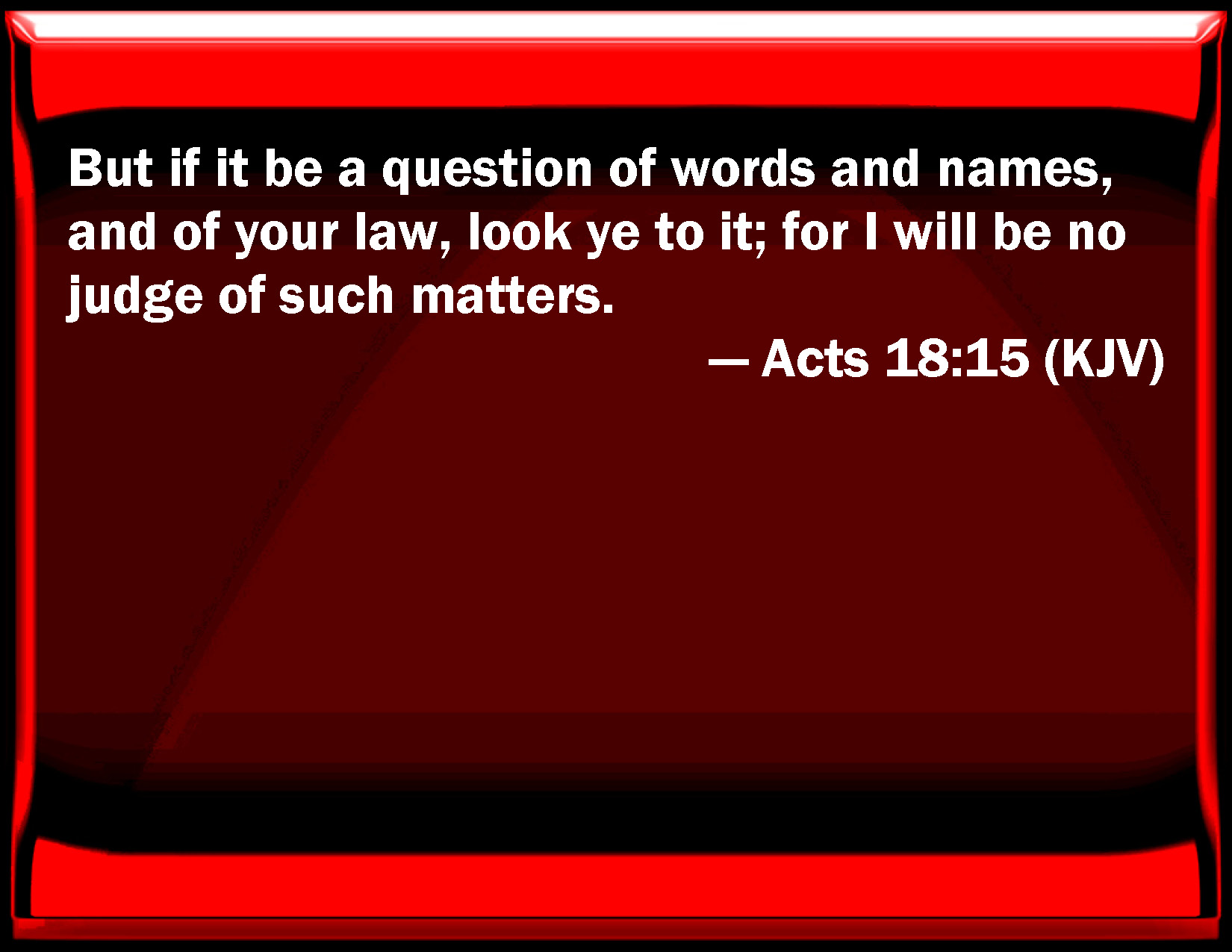 Bible Verse Slide Acts 18:15 But if it be a question of words and names, and of your law, look you to it; for I will be no judge of such matters. KJV: But if it be a question of words and names, and of your law, look ye to it; for I will be no judge of such matters. DRB: But if they be questions of word and names, and of your law, look you to it: I will not be judge of such things. DBT: but if it be questions about words, and names, and the law that ye have, see to it yourselves; for I do not intend to be judge of these things. ERV: but if they are questions about words and names and your own law, look to it yourselves; I am not minded to be a judge of these matters. WBT: But if it is a question of words and names, and of your law, look ye to it: for I will be no judge of such matters. WEB: but if they are questions about words and names and your own law, look to it yourselves. For I don't want to be a judge of these matters." YLT: but if it is a question concerning words and names, and of your law, look ye yourselves to it, for a judge of these things I do not wish to be,'Links Acts 18:15 NIV • Acts 18:15 NLT • Acts 18:15 ESV • Acts 18:15 NASB • Acts 18:15 KJV • Acts 18:15 Interlinear • Acts 18:15 Commentaries • Acts 18:15 Parallel Texts • Acts 18:15 Bible Apps • Acts 18:15 Parallel • Bible Hub |