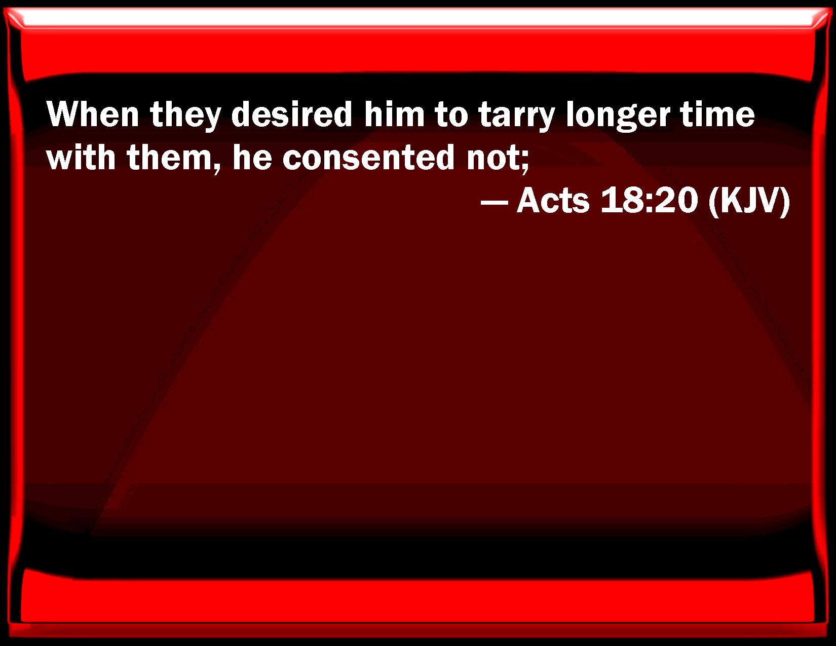 Bible Verse Slide Acts 18:20 When they desired him to tarry longer time with them, he consented not; KJV: When they desired him to tarry longer time with them, he consented not; DRB: And when they desired him, that he would tarry a longer time, he consented not; DBT: And when they asked him that he would remain for a longer time with them he did not accede, ERV: And when they asked him to abide a longer time, he consented not; WBT: When they desired him to tarry longer time with them, he consented not: WEB: When they asked him to stay with them a longer time, he declined; YLT: and they having requested him to remain a longer time with them, he did not consent,Links Acts 18:20 NIV • Acts 18:20 NLT • Acts 18:20 ESV • Acts 18:20 NASB • Acts 18:20 KJV • Acts 18:20 Interlinear • Acts 18:20 Commentaries • Acts 18:20 Parallel Texts • Acts 18:20 Bible Apps • Acts 18:20 Parallel • Bible Hub |