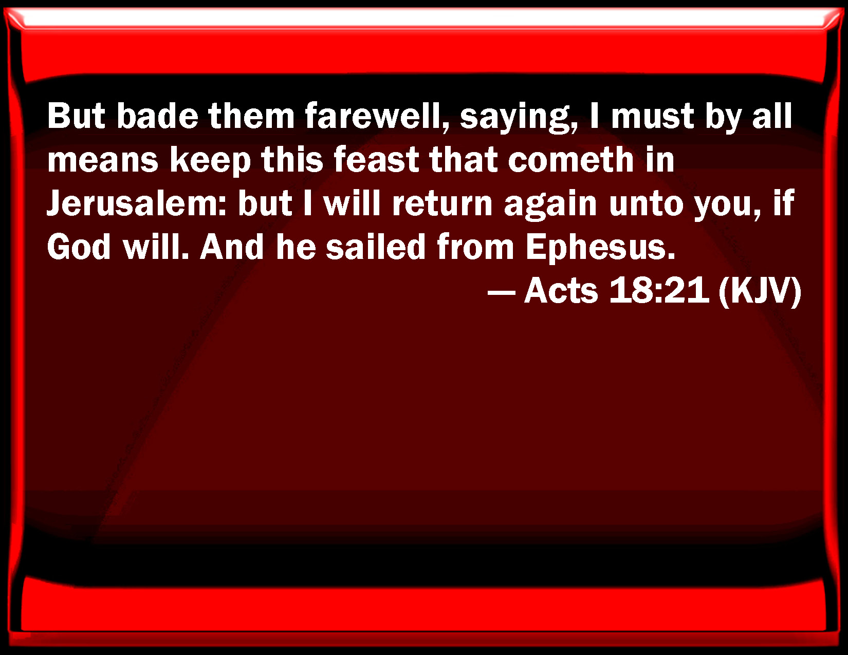Bible Verse Slide Acts 18:21 But bade them farewell, saying, I must by all means keep this feast that comes in Jerusalem: but I will return again to you, if God will. And he sailed from Ephesus. KJV: But bade them farewell, saying, I must by all means keep this feast that cometh in Jerusalem: but I will return again unto you, if God will. And he sailed from Ephesus. DRB: But taking his leave, and saying: I will return to you again, God willing, he departed from Ephesus. DBT: but bade them farewell, saying, I must by all means keep the coming feast at Jerusalem; I will return to you again, if God will: and he sailed away from Ephesus. ERV: but taking his leave of them, and saying, I will return again unto you, if God will, he set sail from Ephesus. WBT: But bade them farewell, saying, I must by all means keep this feast that cometh in Jerusalem: but I will return to you, if God will. And he sailed from Ephesus. WEB: but taking his leave of them, and saying, "I must by all means keep this coming feast in Jerusalem, but I will return again to you if God wills," he set sail from Ephesus. YLT: but took leave of them, saying, 'It behoveth me by all means the coming feast to keep at Jerusalem, and again I will return unto you — God willing.' And he sailed from Ephesus,Links Acts 18:21 NIV • Acts 18:21 NLT • Acts 18:21 ESV • Acts 18:21 NASB • Acts 18:21 KJV • Acts 18:21 Interlinear • Acts 18:21 Commentaries • Acts 18:21 Parallel Texts • Acts 18:21 Bible Apps • Acts 18:21 Parallel • Bible Hub |