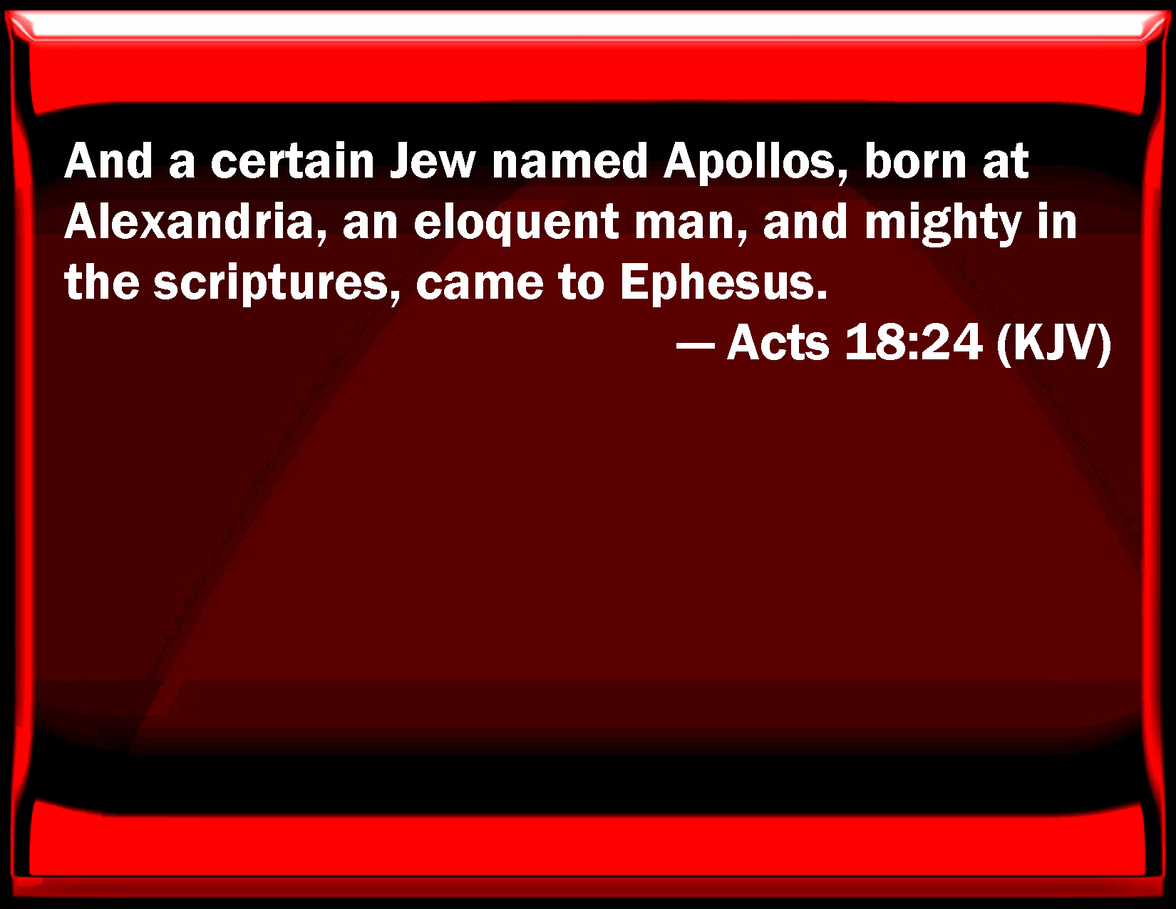 Bible Verse Slide Acts 18:24 And a certain Jew named Apollos, born at Alexandria, an eloquent man, and mighty in the scriptures, came to Ephesus. KJV: And a certain Jew named Apollos, born at Alexandria, an eloquent man, and mighty in the scriptures, came to Ephesus. DRB: Now a certain Jew, named Apollo, born at Alexandria, an eloquent man, came to Ephesus, one mighty in the scriptures. DBT: But a certain Jew, Apollos by name, an Alexandrian by race, an eloquent man, who was mighty in the scriptures, arrived at Ephesus. ERV: Now a certain Jew named Apollos, an Alexandrian by race, a learned man, came to Ephesus; and he was mighty in the scriptures. WBT: And a certain Jew named Apollos, born at Alexandria, an eloquent man, and mighty in the scriptures, came to Ephesus. WEB: Now a certain Jew named Apollos, an Alexandrian by race, an eloquent man, came to Ephesus. He was mighty in the Scriptures. YLT: And a certain Jew, Apollos by name, an Alexandrian by birth, a man of eloquence, being mighty in the Writings, came to Ephesus,Links Acts 18:24 NIV • Acts 18:24 NLT • Acts 18:24 ESV • Acts 18:24 NASB • Acts 18:24 KJV • Acts 18:24 Interlinear • Acts 18:24 Commentaries • Acts 18:24 Parallel Texts • Acts 18:24 Bible Apps • Acts 18:24 Parallel • Bible Hub |