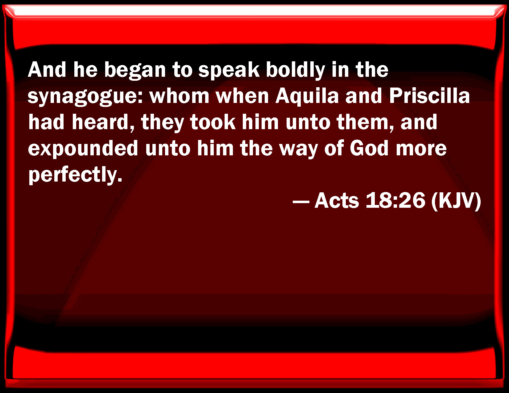 Bible Verse Slide Acts 18:26 And he began to speak boldly in the synagogue: whom when Aquila and Priscilla had heard, they took him to them, and expounded to him the way of God more perfectly. KJV: And he began to speak boldly in the synagogue: whom when Aquila and Priscilla had heard, they took him unto them, and expounded unto him the way of God more perfectly. DRB: This man therefore began to speak boldly in the synagogue. Whom when Priscilla and Aquila had heard, they took him to them, and expounded to him the way of the Lord more diligently. DBT: And he began to speak boldly in the synagogue. And Aquila and Priscilla, having heard him, took him to them and unfolded to him the way of God more exactly. ERV: and he began to speak boldly in the synagogue. But when Priscilla and Aquila heard him, they took him unto them, and expounded unto him the way of God more carefully. WBT: And he began to speak boldly in the synagogue: Whom, when Aquila and Priscilla had heard, they took him to them, and expounded to him the way of God more perfectly. WEB: He began to speak boldly in the synagogue. But when Priscilla and Aquila heard him, they took him aside, and explained to him the way of God more accurately. YLT: this one also began to speak boldly in the synagogue, and Aquilas and Priscilla having heard of him, took him to them, and did more exactly expound to him the way of God,Links Acts 18:26 NIV • Acts 18:26 NLT • Acts 18:26 ESV • Acts 18:26 NASB • Acts 18:26 KJV • Acts 18:26 Interlinear • Acts 18:26 Commentaries • Acts 18:26 Parallel Texts • Acts 18:26 Bible Apps • Acts 18:26 Parallel • Bible Hub |