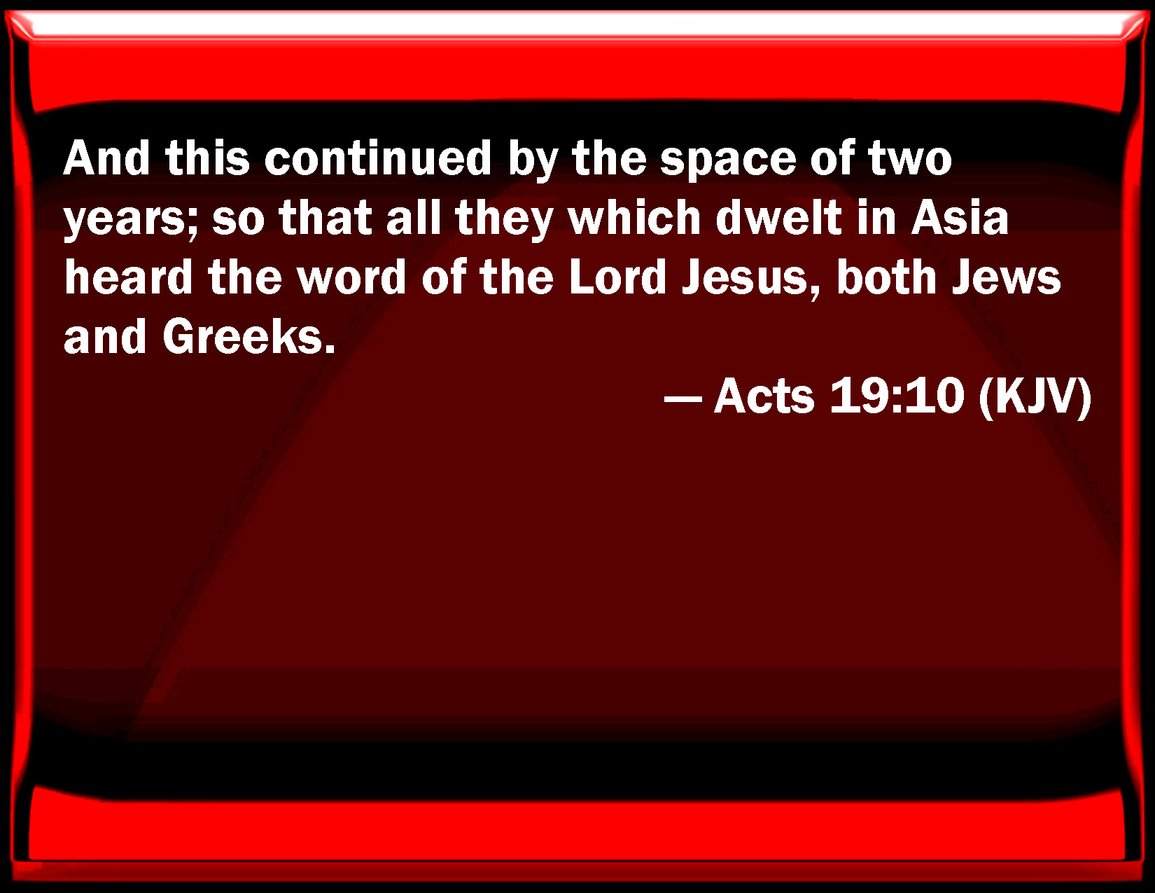 Bible Verse Slide Acts 19:10 And this continued by the space of two years; so that all they which dwelled in Asia heard the word of the Lord Jesus, both Jews and Greeks. KJV: And this continued by the space of two years; so that all they which dwelt in Asia heard the word of the Lord Jesus, both Jews and Greeks. DRB: And this continued for the space of two years, so that all they who dwelt in Asia, heard the word of the Lord, both Jews and Gentiles. DBT: And this took place for two years, so that all that inhabited Asia heard the word of the Lord, both Jews and Greeks. ERV: And this continued for the space of two years; so that all they which dwelt in Asia heard the word of the Lord, both Jews and Greeks. WBT: And this continued for the space of two years; so that all they who dwelt in Asia heard the word of the Lord Jesus, both Jews and Greeks. WEB: This continued for two years, so that all those who lived in Asia heard the word of the Lord Jesus, both Jews and Greeks. YLT: And this happened for two years so that all those dwelling in Asia did hear the word of the Lord Jesus, both Jews and Greeks,Links Acts 19:10 NIV • Acts 19:10 NLT • Acts 19:10 ESV • Acts 19:10 NASB • Acts 19:10 KJV • Acts 19:10 Interlinear • Acts 19:10 Commentaries • Acts 19:10 Parallel Texts • Acts 19:10 Bible Apps • Acts 19:10 Parallel • Bible Hub |