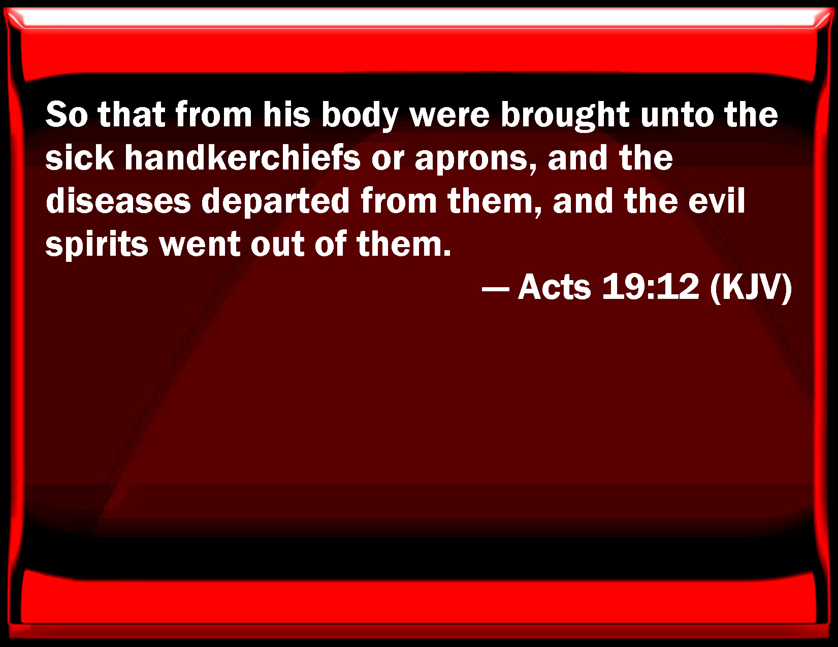 Bible Verse Slide Acts 19:12 So that from his body were brought to the sick handkerchiefs or aprons, and the diseases departed from them, and the evil spirits went out of them. KJV: So that from his body were brought unto the sick handkerchiefs or aprons, and the diseases departed from them, and the evil spirits went out of them. DRB: So that even there were brought from his body to the sick, handkerchiefs and aprons, and the diseases departed from them, and the wicked spirits went out of them. DBT: so that even napkins or aprons were brought from his body and put upon the sick, and the diseases left them, and the wicked spirits went out. ERV: insomuch that unto the sick were carried away from his body handkerchiefs or aprons, and the diseases departed from them, and the evil spirits went out. WBT: So that from his body were brought to the sick, handkerchiefs, or aprons, and the diseases departed from them, and the evil spirits went out of them. WEB: so that even handkerchiefs or aprons were carried away from his body to the sick, and the evil spirits went out. YLT: so that even unto the ailing were brought from his body handkerchiefs or aprons, and the sicknesses departed from them; the evil spirits also went forth from them.Links Acts 19:12 NIV • Acts 19:12 NLT • Acts 19:12 ESV • Acts 19:12 NASB • Acts 19:12 KJV • Acts 19:12 Interlinear • Acts 19:12 Commentaries • Acts 19:12 Parallel Texts • Acts 19:12 Bible Apps • Acts 19:12 Parallel • Bible Hub |