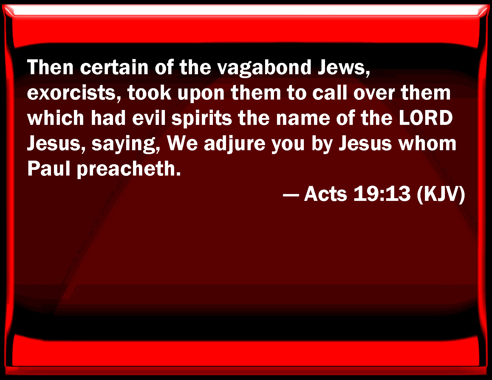 Bible Verse Slide Acts 19:13 Then certain of the vagabond Jews, exorcists, took on them to call over them which had evil spirits the name of the LORD Jesus, saying, We adjure you by Jesus whom Paul preaches. KJV: Then certain of the vagabond Jews, exorcists, took upon them to call over them which had evil spirits the name of the Lord Jesus, saying, We adjure you by Jesus whom Paul preacheth. DRB: Now some also of the Jewish exorcists who went about, attempted to invoke over them that had evil spirits, the name of the Lord Jesus, saying: I conjure you by Jesus, whom Paul preacheth. DBT: And certain of the Jewish exorcists also, who went about, took in hand to call upon those who had wicked spirits the name of the Lord Jesus, saying, I adjure you by Jesus, whom Paul preaches. ERV: But certain also of the strolling Jews, exorcists, took upon them to name over them which had the evil spirits the name of the Lord Jesus, saying, I adjure you by Jesus whom Paul preacheth. WBT: Then certain of the vagabond Jews, exorcists, took upon them to call over them who had evil spirits, the name of the Lord Jesus, saying, We adjure you by Jesus whom Paul preacheth. WEB: But some of the itinerant Jews, exorcists, took on themselves to invoke over those who had the evil spirits the name of the Lord Jesus, saying, "We adjure you by Jesus whom Paul preaches." YLT: And certain of the wandering exorcist Jews, took upon them to name over those having the evil spirits the name of the Lord Jesus, saying, 'We adjure you by Jesus, whom Paul doth preach;'Links Acts 19:13 NIV • Acts 19:13 NLT • Acts 19:13 ESV • Acts 19:13 NASB • Acts 19:13 KJV • Acts 19:13 Interlinear • Acts 19:13 Commentaries • Acts 19:13 Parallel Texts • Acts 19:13 Bible Apps • Acts 19:13 Parallel • Bible Hub |