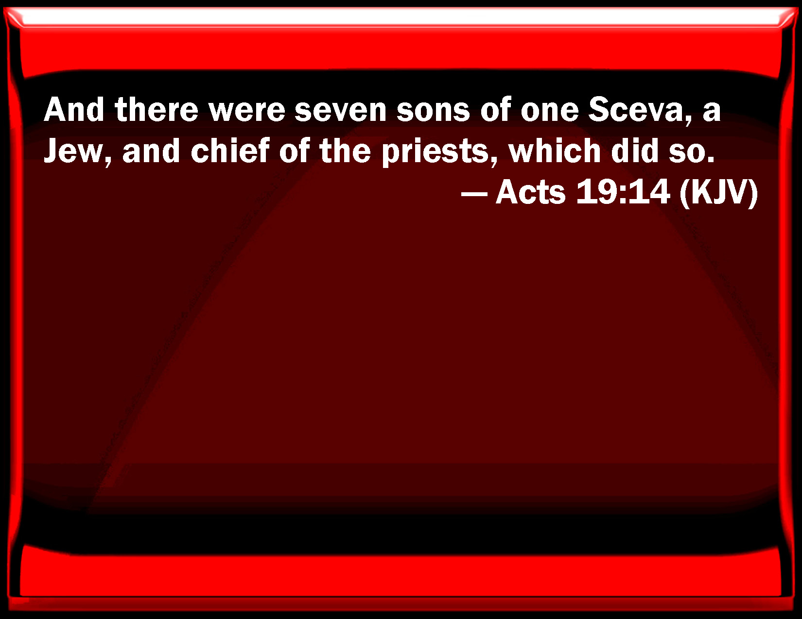 Bible Verse Slide Acts 19:14 And there were seven sons of one Sceva, a Jew, and chief of the priests, which did so. KJV: And there were seven sons of one Sceva, a Jew, and chief of the priests, which did so. DRB: And there were certain men, seven sons of Sceva, a Jew, a chief priest, that did this. DBT: And there were certain men, seven sons of Sceva, Jewish high priest, who were doing this. ERV: And there were seven sons of one Sceva, a Jew, a chief priest, which did this. WBT: And there were seven sons of one Sceva a Jew, and chief of the priests, who did so. WEB: There were seven sons of one Sceva, a Jewish chief priest, who did this. YLT: and there were certain — seven sons of Sceva, a Jew, a chief priest — who are doing this thing;Links Acts 19:14 NIV • Acts 19:14 NLT • Acts 19:14 ESV • Acts 19:14 NASB • Acts 19:14 KJV • Acts 19:14 Interlinear • Acts 19:14 Commentaries • Acts 19:14 Parallel Texts • Acts 19:14 Bible Apps • Acts 19:14 Parallel • Bible Hub |