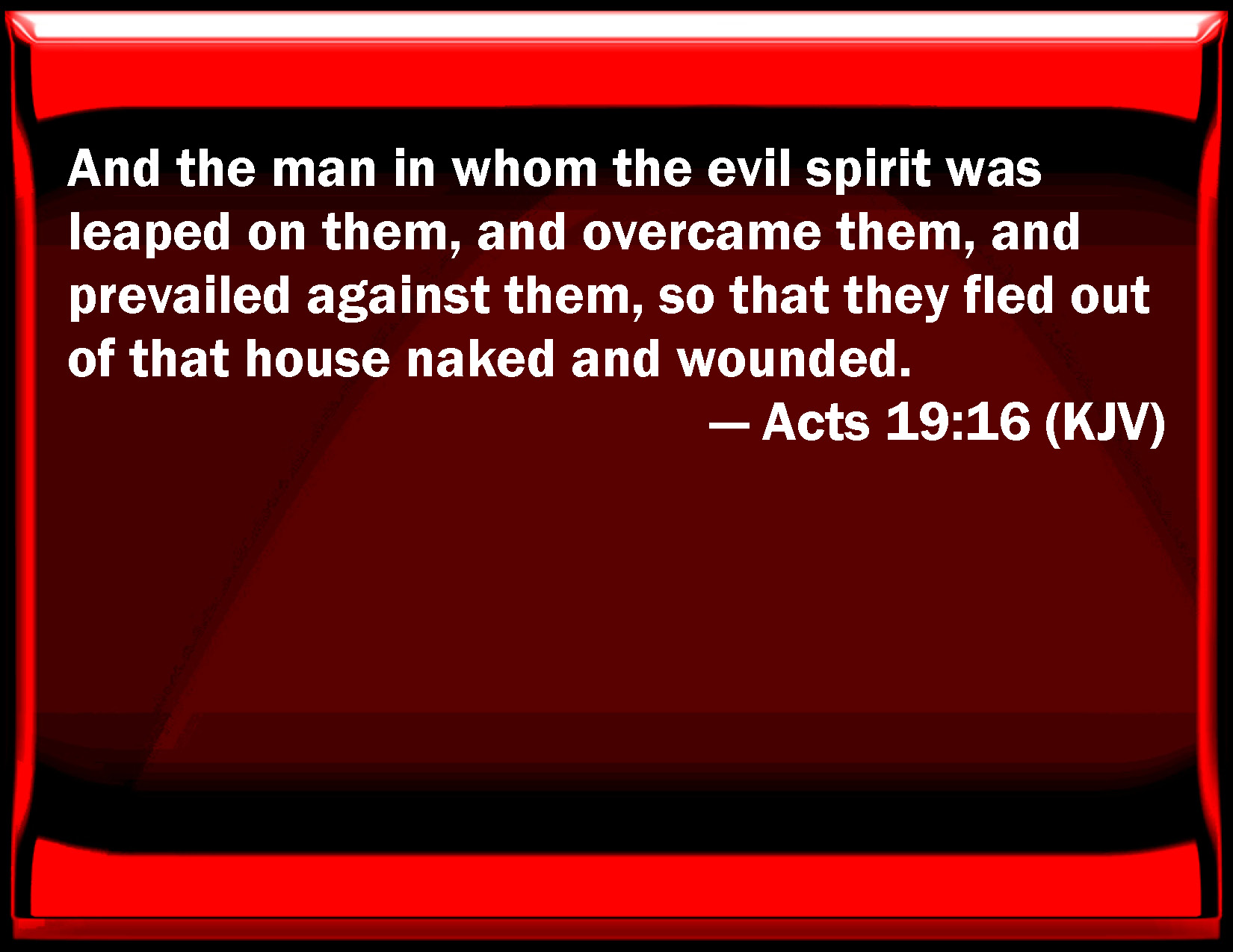 Bible Verse Slide Acts 19:16 And the man in whom the evil spirit was leaped on them, and overcame them, and prevailed against them, so that they fled out of that house naked and wounded. KJV: And the man in whom the evil spirit was leaped on them, and overcame them, and prevailed against them, so that they fled out of that house naked and wounded. DRB: And the man in whom the wicked spirit was, leaping upon them, and mastering them both, prevailed against them, so that they fled out of that house naked and wounded. DBT: And the man in whom the wicked spirit was leaped upon them, and having mastered both, prevailed against them, so that they fled out of that house naked and wounded. ERV: And the man in whom the evil spirit was leaped on them, and mastered both of them, and prevailed against them, so that they fled out of that house naked and wounded. WBT: And the man in whom the evil spirit was, leaped on them, and overcame them, and prevailed against them, so that they fled out of that house naked and wounded. WEB: The man in whom the evil spirit was leaped on them, and overpowered them, and prevailed against them, so that they fled out of that house naked and wounded. YLT: And the man, in whom was the evil spirit, leaping upon them, and having overcome them, prevailed against them, so that naked and wounded they did flee out of that house,Links Acts 19:16 NIV • Acts 19:16 NLT • Acts 19:16 ESV • Acts 19:16 NASB • Acts 19:16 KJV • Acts 19:16 Interlinear • Acts 19:16 Commentaries • Acts 19:16 Parallel Texts • Acts 19:16 Bible Apps • Acts 19:16 Parallel • Bible Hub |