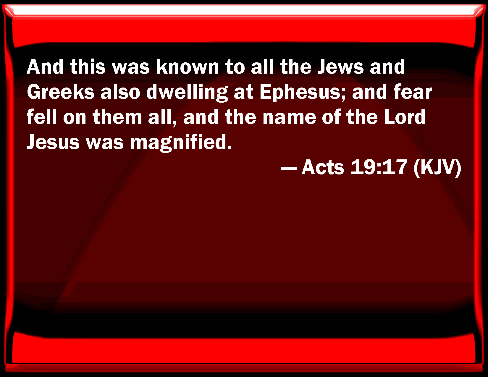 Bible Verse Slide Acts 19:17 And this was known to all the Jews and Greeks also dwelling at Ephesus; and fear fell on them all, and the name of the Lord Jesus was magnified. KJV: And this was known to all the Jews and Greeks also dwelling at Ephesus; and fear fell on them all, and the name of the Lord Jesus was magnified. DRB: And this became known to all the Jews and the Gentiles that dwelt at Ephesus; and fear fell on them all, and the name of the Lord Jesus was magnified. DBT: And this became known to all, both Jews and Greeks, who inhabited Ephesus, and fear fell upon all of them, and the name of the Lord Jesus was magnified. ERV: And this became known to all, both Jews and Greeks, that dwelt at Ephesus; and fear fell upon them all, and the name of the Lord Jesus was magnified. WBT: And this was known to all the Jews and Greeks also dwelling at Ephesus: and fear fell on them all, and the name of the Lord Jesus was magnified. WEB: This became known to all, both Jews and Greeks, who lived at Ephesus. Fear fell on them all, and the name of the Lord Jesus was magnified. YLT: and this became known to all, both Jews and Greeks, who are dwelling at Ephesus, and fear fell upon them all, and the name of the Lord Jesus was being magnified,Links Acts 19:17 NIV • Acts 19:17 NLT • Acts 19:17 ESV • Acts 19:17 NASB • Acts 19:17 KJV • Acts 19:17 Interlinear • Acts 19:17 Commentaries • Acts 19:17 Parallel Texts • Acts 19:17 Bible Apps • Acts 19:17 Parallel • Bible Hub |