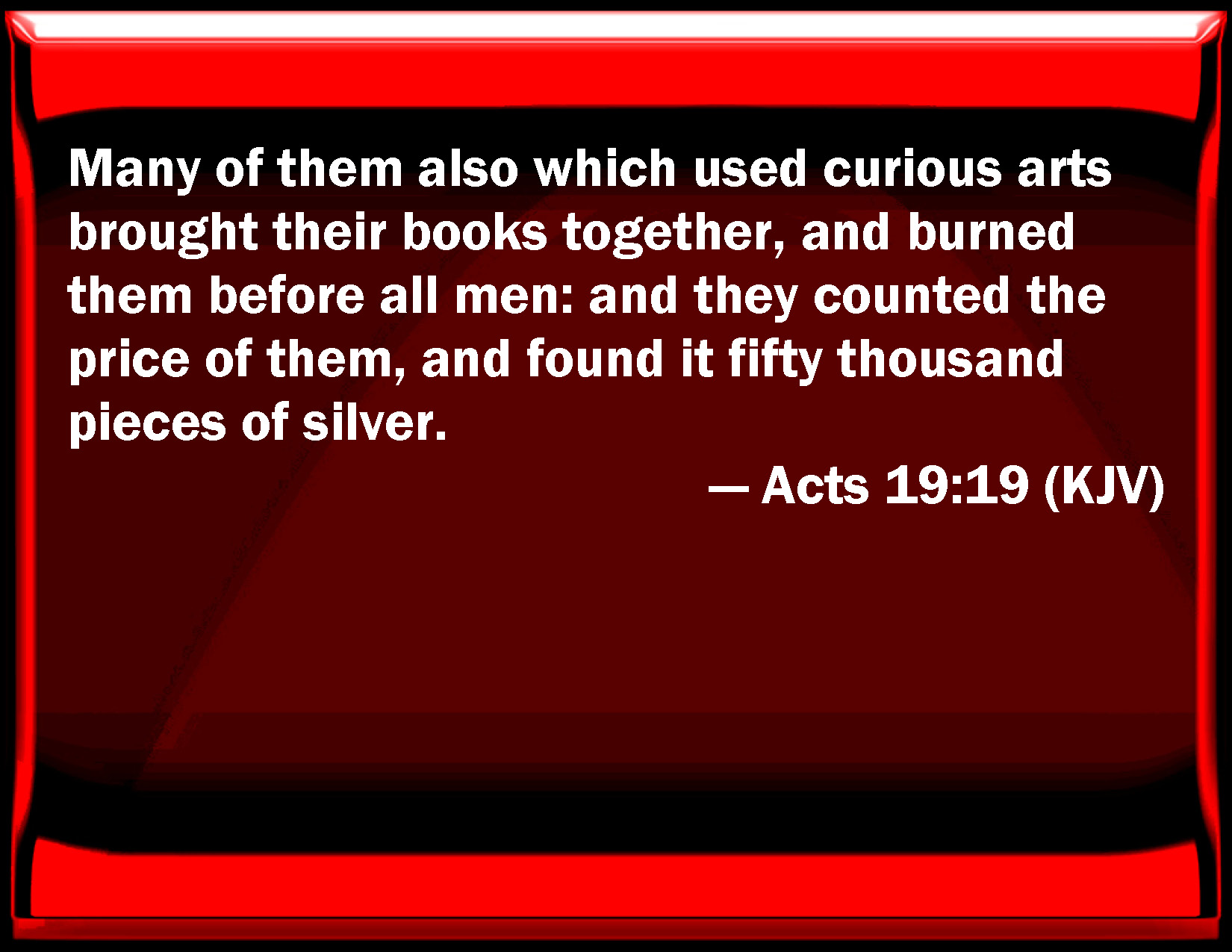 Bible Verse Slide Acts 19:19 Many of them also which used curious arts brought their books together, and burned them before all men: and they counted the price of them, and found it fifty thousand pieces of silver. KJV: Many of them also which used curious arts brought their books together, and burned them before all men: and they counted the price of them, and found it fifty thousand pieces of silver. DRB: And many of them who had followed curious arts, brought together their books, and burnt them before all; and counting the price of them, they found the money to be fifty thousand pieces of silver. DBT: And many of those that practised curious arts brought their books of charms and burnt them before all. And they reckoned up the prices of them, and found it fifty thousand pieces of silver. ERV: And not a few of them that practised curious arts brought their books together, and burned them in the sight of all: and they counted the price of them, and found it fifty thousand pieces of silver. WBT: Many also of them who used curious arts, brought their books together, and burned them before all men; and they counted the price of them, and found it fifty thousand pieces of silver. WEB: Many of those who practiced magical arts brought their books together and burned them in the sight of all. They counted the price of them, and found it to be fifty thousand pieces of silver. YLT: and many of those who had practised the curious arts, having brought the books together, were burning them before all; and they reckoned together the prices of them, and found it five myriads of silverlings;Links Acts 19:19 NIV • Acts 19:19 NLT • Acts 19:19 ESV • Acts 19:19 NASB • Acts 19:19 KJV • Acts 19:19 Interlinear • Acts 19:19 Commentaries • Acts 19:19 Parallel Texts • Acts 19:19 Bible Apps • Acts 19:19 Parallel • Bible Hub |