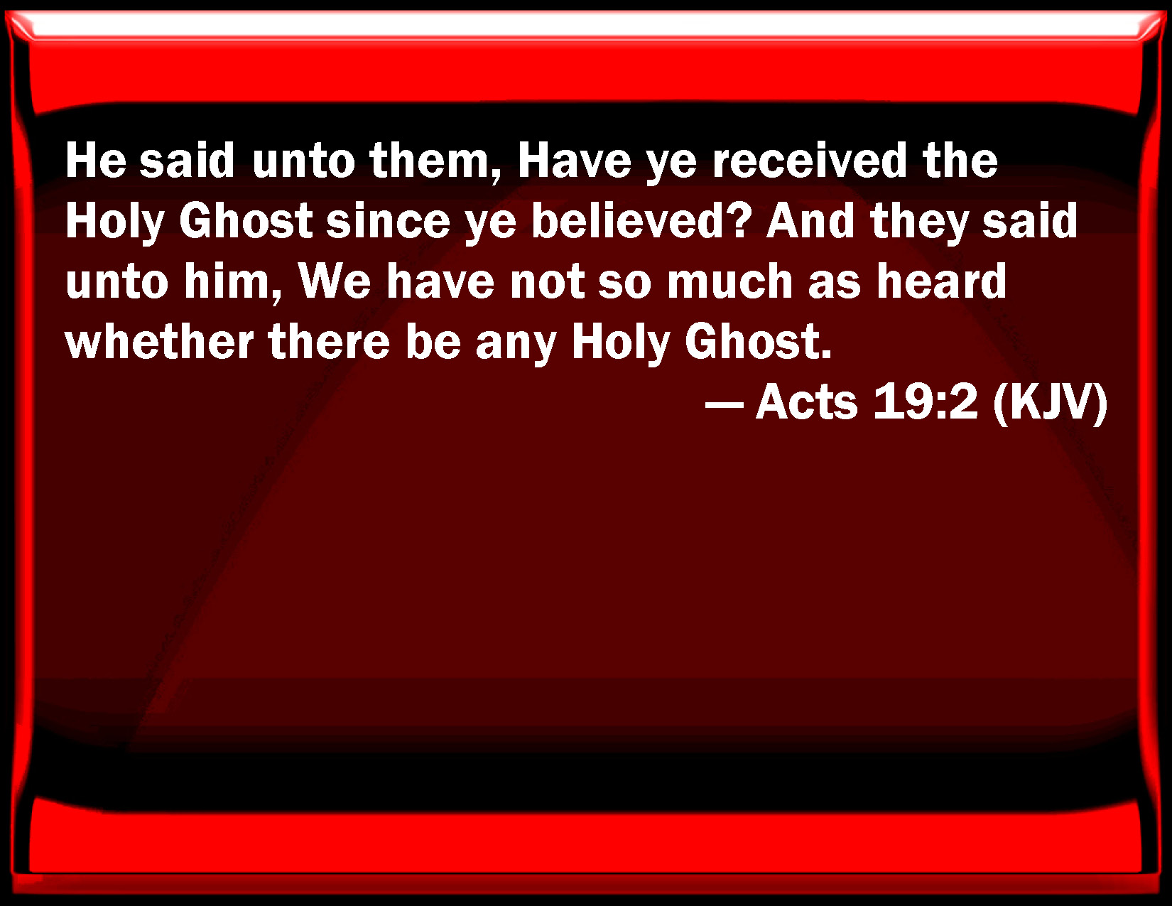 Bible Verse Slide Acts 19:2 He said to them, Have you received the Holy Ghost since you believed? And they said to him, We have not so much as heard whether there be any Holy Ghost. KJV: He said unto them, Have ye received the Holy Ghost since ye believed? And they said unto him, We have not so much as heard whether there be any Holy Ghost. DRB: And he said to them: Have you received the Holy Ghost since ye believed? But they said to him: We have not so much as heard whether there be a Holy Ghost. DBT: he said to them, Did ye receive the Holy Spirit when ye had believed? And they said to him, We did not even hear if the Holy Spirit was come. ERV: and he said unto them, Did ye receive the Holy Ghost when ye believed? And they said unto him, Nay, we did not so much as hear whether the Holy Ghost was given. WBT: He said to them, Have ye received the Holy Spirit since ye believed? And they said to him, We have not so much as heard whether there is any Holy Spirit. WEB: He said to them, "Did you receive the Holy Spirit when you believed?" They said to him, "No, we haven't even heard that there is a Holy Spirit." YLT: he said unto them, 'The Holy Spirit did ye receive — having believed?' and they said unto him, 'But we did not even hear whether there is any Holy Spirit;'Links Acts 19:2 NIV • Acts 19:2 NLT • Acts 19:2 ESV • Acts 19:2 NASB • Acts 19:2 KJV • Acts 19:2 Interlinear • Acts 19:2 Commentaries • Acts 19:2 Parallel Texts • Acts 19:2 Bible Apps • Acts 19:2 Parallel • Bible Hub |
