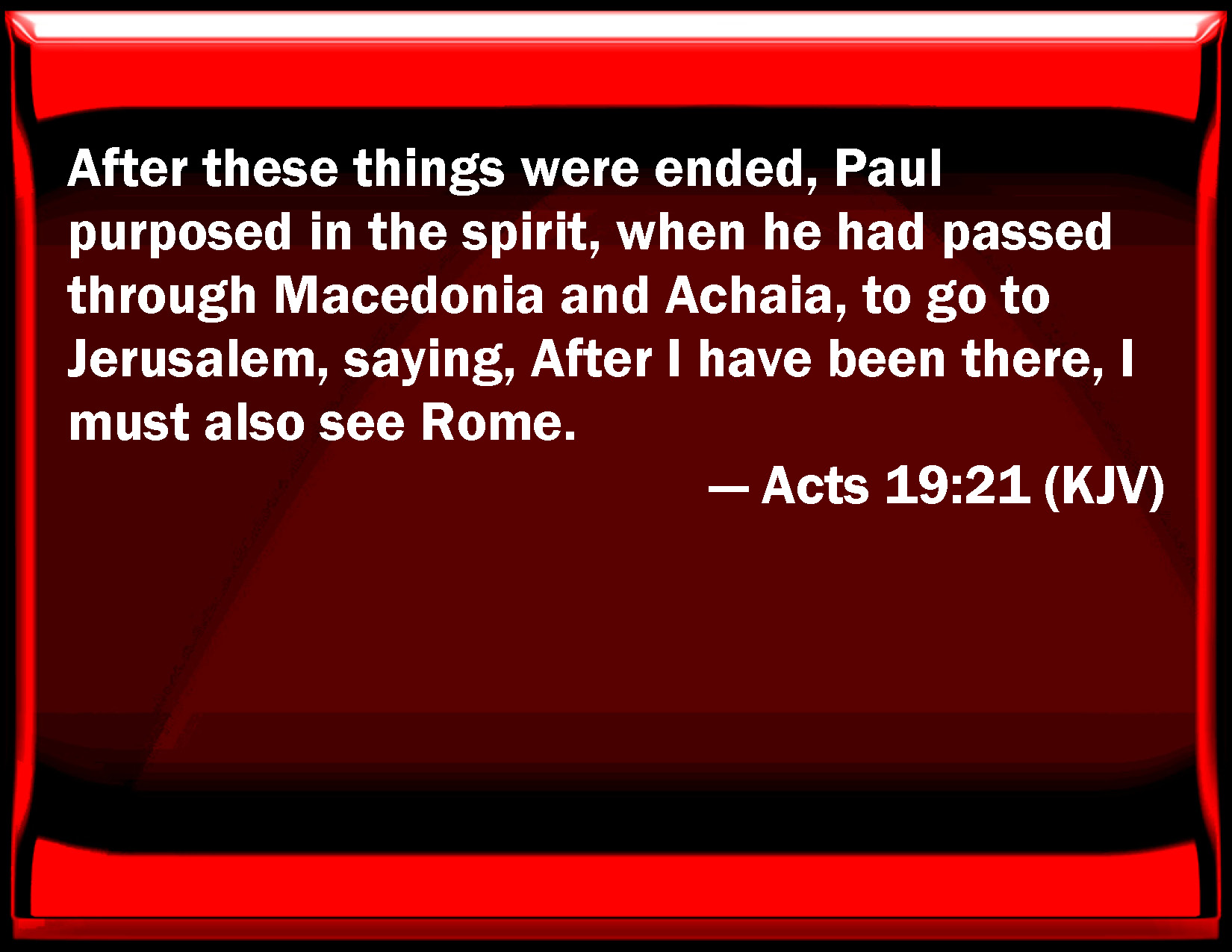 Bible Verse Slide Acts 19:21 After these things were ended, Paul purposed in the spirit, when he had passed through Macedonia and Achaia, to go to Jerusalem, saying, After I have been there, I must also see Rome. KJV: After these things were ended, Paul purposed in the spirit, when he had passed through Macedonia and Achaia, to go to Jerusalem, saying, After I have been there, I must also see Rome. DRB: And when these things were ended, Paul purposed in the spirit, when he had passed through Macedonia and Achaia, to go to Jerusalem, saying: After I have been there, I must see Rome also. DBT: And when these things were fulfilled, Paul purposed in his spirit to go to Jerusalem, passing through Macedonia and Achaia, saying, After I have been there I must see Rome also. ERV: Now after these things were ended, Paul purposed in the spirit, when he had passed through Macedonia and Achaia, to go to Jerusalem, saying, After I have been there, I must also see Rome. WBT: After these things were ended, Paul purposed in the spirit, when he had passed through Macedonia, and Achaia, to go to Jerusalem, saying, After I have been there, I must also see Rome. WEB: Now after these things had ended, Paul determined in the spirit, when he had passed through Macedonia and Achaia, to go to Jerusalem, saying, "After I have been there, I must also see Rome." YLT: And when these things were fulfilled, Paul purposed in the Spirit, having gone through Macedonia and Achaia, to go on to Jerusalem, saying — 'After my being there, it behoveth me also to see Rome;'Links Acts 19:21 NIV • Acts 19:21 NLT • Acts 19:21 ESV • Acts 19:21 NASB • Acts 19:21 KJV • Acts 19:21 Interlinear • Acts 19:21 Commentaries • Acts 19:21 Parallel Texts • Acts 19:21 Bible Apps • Acts 19:21 Parallel • Bible Hub |