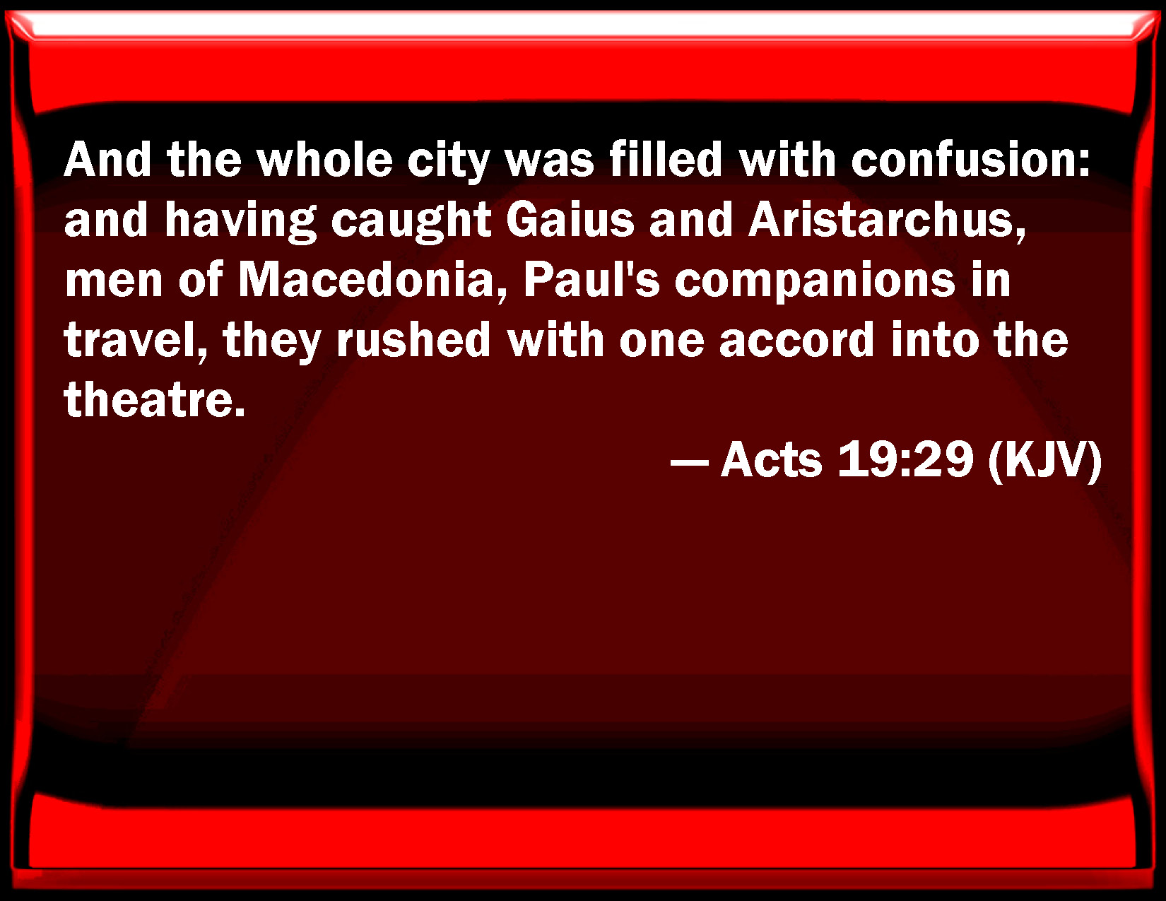 Bible Verse Slide Acts 19:29 And the whole city was filled with confusion: and having caught Gaius and Aristarchus, men of Macedonia, Paul's companions in travel, they rushed with one accord into the theatre. KJV: And the whole city was filled with confusion: and having caught Gaius and Aristarchus, men of Macedonia, Paul's companions in travel, they rushed with one accord into the theatre. DRB: And the whole city was filled with confusion; and having caught Gaius and Aristarchus, men of Macedonia, Paul's companions, they rushed with one accord into the theatre. DBT: And the whole city was filled with confusion, and they rushed with one accord to the theatre, having seized and carried off with them Gaius and Aristarchus, Macedonians, fellow-travellers of Paul. ERV: And the city was filled with the confusion: and they rushed with one accord into the theatre, having seized Gaius and Aristarchus, men of Macedonia, Paul's companions in travel. WBT: And the whole city was filled with confusion: and having caught Gaius and Aristarchus, men of Macedonia, Paul's companions in travel, they rushed with one accord into the theater. WEB: The whole city was filled with confusion, and they rushed with one accord into the theater, having seized Gaius and Aristarchus, men of Macedonia, Paul's companions in travel. YLT: and the whole city was filled with confusion, they rushed also with one accord into the theatre, having caught Gaius and Aristarchus, Macedonians, Paul's fellow-travellers.Links Acts 19:29 NIV • Acts 19:29 NLT • Acts 19:29 ESV • Acts 19:29 NASB • Acts 19:29 KJV • Acts 19:29 Interlinear • Acts 19:29 Commentaries • Acts 19:29 Parallel Texts • Acts 19:29 Bible Apps • Acts 19:29 Parallel • Bible Hub |