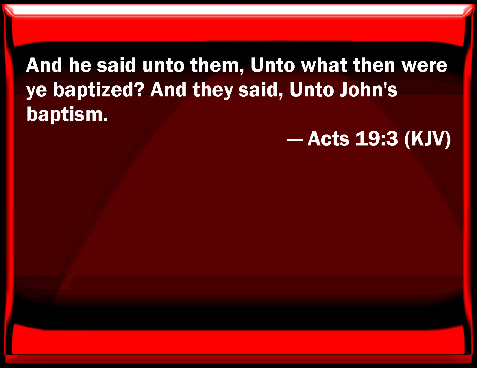 Bible Verse Slide Acts 19:3 And he said to them, To what then were you baptized? And they said, To John's baptism. KJV: And he said unto them, Unto what then were ye baptized? And they said, Unto John's baptism. DRB: And he said: In what then were you baptized? Who said: In John's baptism. DBT: And he said, To what then were ye baptised? And they said, To the baptism of John. ERV: And he said, Into what then were ye baptized? And they said, Into John's baptism. WBT: And he said to them, Into what then were ye baptized? And they said, Into John's baptism. WEB: He said, "Into what then were you baptized?" They said, "Into John's baptism." YLT: and he said unto them, 'To what, then, were ye baptized?' and they said, 'To John's baptism.'Links Acts 19:3 NIV • Acts 19:3 NLT • Acts 19:3 ESV • Acts 19:3 NASB • Acts 19:3 KJV • Acts 19:3 Interlinear • Acts 19:3 Commentaries • Acts 19:3 Parallel Texts • Acts 19:3 Bible Apps • Acts 19:3 Parallel • Bible Hub |