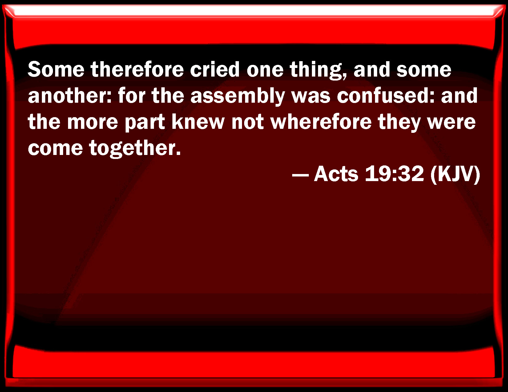 Bible Verse Slide Acts 19:32 Some therefore cried one thing, and some another: for the assembly was confused: and the more part knew not why they were come together. KJV: Some therefore cried one thing, and some another: for the assembly was confused; and the more part knew not wherefore they were come together. DRB: Now some cried one thing, some another. For the assembly was confused, and the greater part knew not for what cause they were come together. DBT: Different persons therefore cried out some different thing; for the assembly was tumultuous, and the most did not know for what cause they had come together. ERV: Some therefore cried one thing, and some another: for the assembly was in confusion; and the more part knew not wherefore they were come together. WBT: Some therefore cried one thing, and some another: for the assembly was confused, and the greater part knew not why they had come together. WEB: Some therefore cried one thing, and some another, for the assembly was in confusion. Most of them didn't know why they had come together. YLT: Some indeed, therefore, were calling out one thing, and some another, for the assembly was confused, and the greater part did not know for what they were come together;Links Acts 19:32 NIV • Acts 19:32 NLT • Acts 19:32 ESV • Acts 19:32 NASB • Acts 19:32 KJV • Acts 19:32 Interlinear • Acts 19:32 Commentaries • Acts 19:32 Parallel Texts • Acts 19:32 Bible Apps • Acts 19:32 Parallel • Bible Hub |
