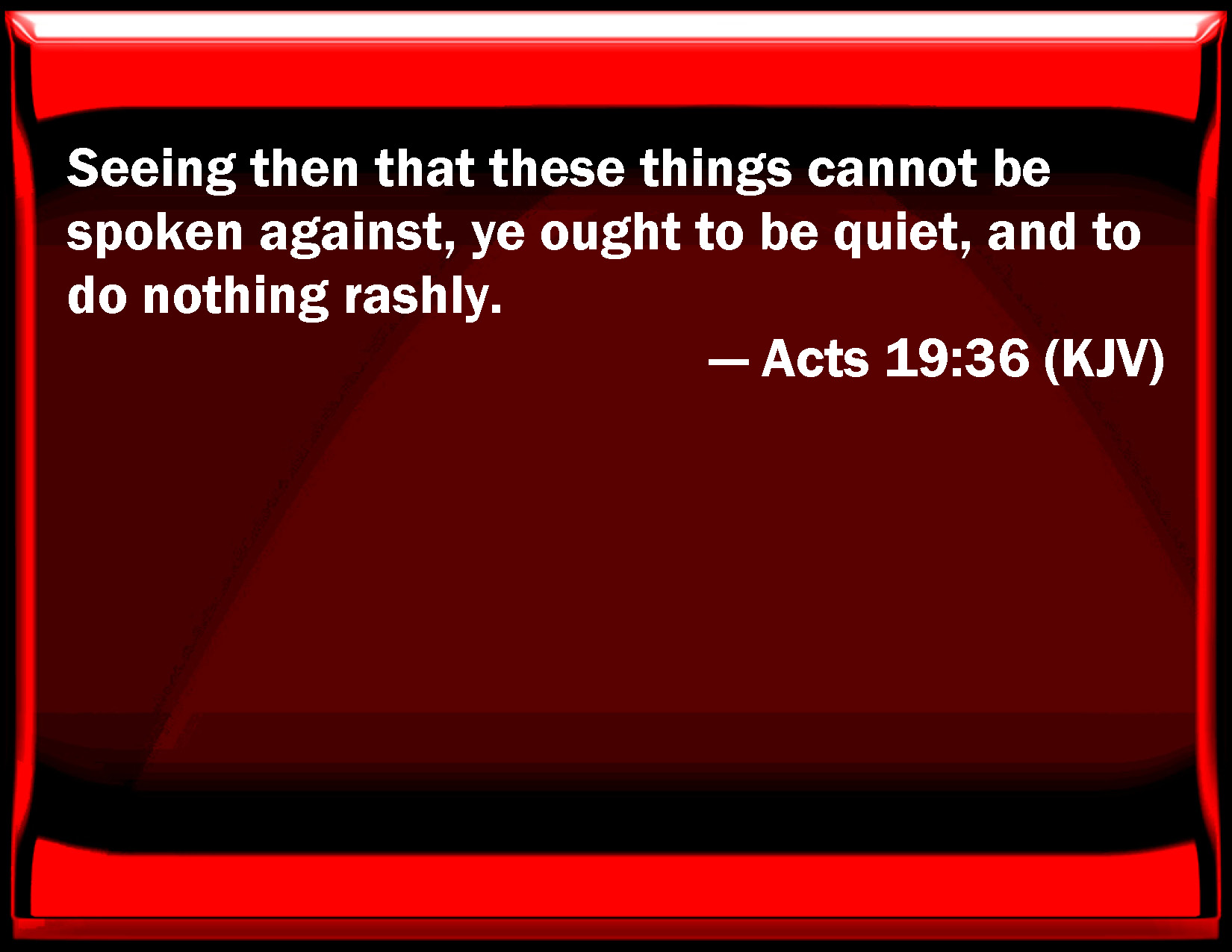 Bible Verse Slide Acts 19:36 Seeing then that these things cannot be spoken against, you ought to be quiet, and to do nothing rashly. KJV: Seeing then that these things cannot be spoken against, ye ought to be quiet, and to do nothing rashly. DRB: For as much therefore as these things cannot be contradicted, you ought to be quiet, and to do nothing rashly. DBT: These things therefore being undeniable, it is necessary that ye should be calm and do nothing headlong. ERV: Seeing then that these things cannot be gainsaid, ye ought to be quiet, and to do nothing rash. WBT: Seeing then that these things cannot be contradicted, ye ought to be quiet, and to do nothing rashly. WEB: Seeing then that these things can't be denied, you ought to be quiet, and to do nothing rash. YLT: these things, then, not being to be gainsaid, it is necessary for you to be quiet, and to do nothing rashly.Links Acts 19:36 NIV • Acts 19:36 NLT • Acts 19:36 ESV • Acts 19:36 NASB • Acts 19:36 KJV • Acts 19:36 Interlinear • Acts 19:36 Commentaries • Acts 19:36 Parallel Texts • Acts 19:36 Bible Apps • Acts 19:36 Parallel • Bible Hub |