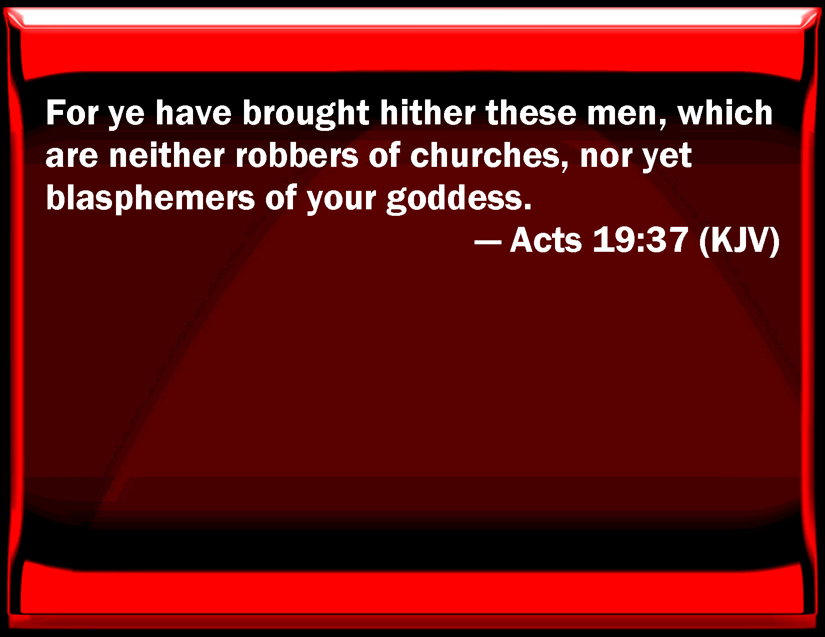 Bible Verse Slide Acts 19:37 For you have brought here these men, which are neither robbers of churches, nor yet blasphemers of your goddess. KJV: For ye have brought hither these men, which are neither robbers of churches, nor yet blasphemers of your goddess. DRB: For you have brought hither these men, who are neither guilty of sacrilege, nor of blasphemy against your goddess. DBT: For ye have brought these men, who are neither temple-plunderers, nor speak injuriously of your goddess. ERV: For ye have brought hither these men, which are neither robbers of temples nor blasphemers of our goddess. WBT: For ye have brought hither these men, who are neither robbers of churches, nor yet blasphemers of your goddess. WEB: For you have brought these men here, who are neither robbers of temples nor blasphemers of your goddess. YLT: 'For ye brought these men, who are neither temple-robbers nor speaking evil of your goddess;Links Acts 19:37 NIV • Acts 19:37 NLT • Acts 19:37 ESV • Acts 19:37 NASB • Acts 19:37 KJV • Acts 19:37 Interlinear • Acts 19:37 Commentaries • Acts 19:37 Parallel Texts • Acts 19:37 Bible Apps • Acts 19:37 Parallel • Bible Hub |