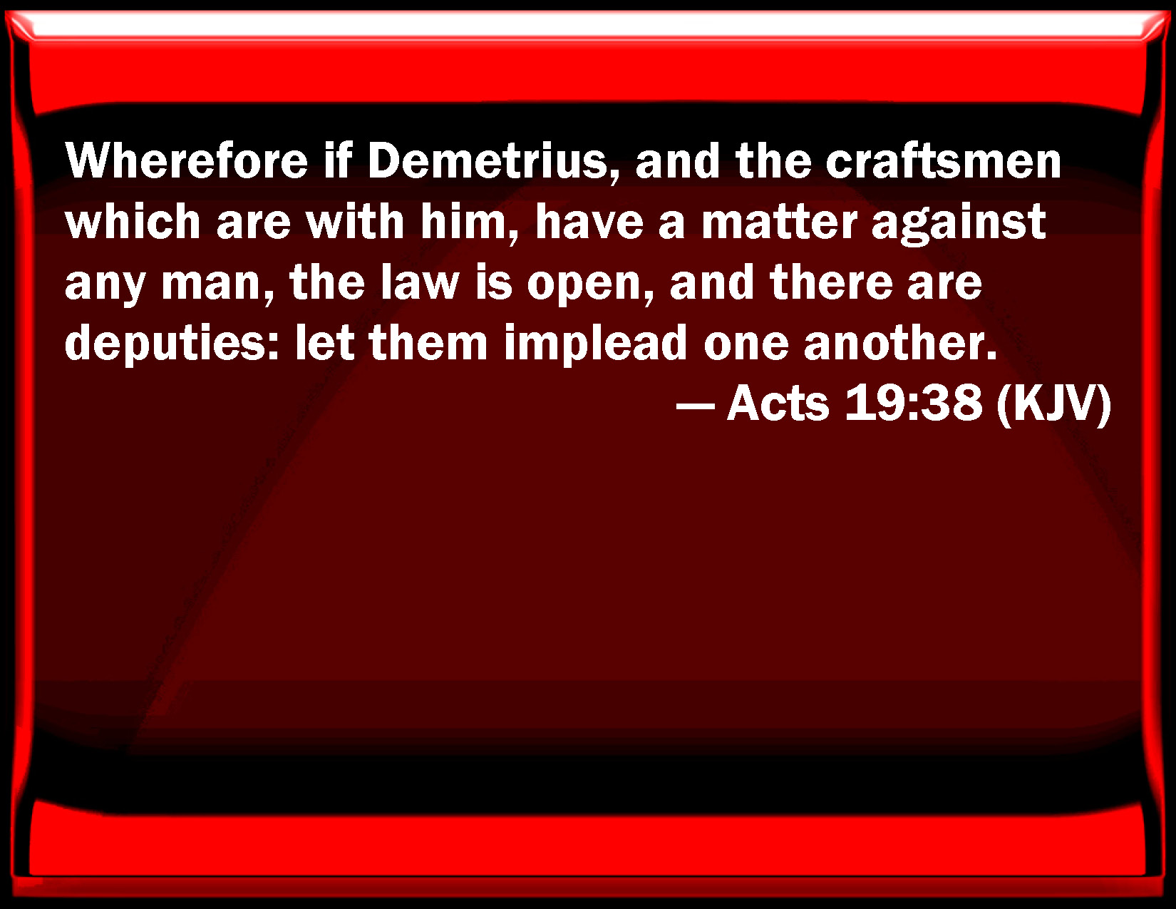 Bible Verse Slide Acts 19:38 Why if Demetrius, and the craftsmen which are with him, have a matter against any man, the law is open, and there are deputies: let them accuse one another. KJV: Wherefore if Demetrius, and the craftsmen which are with him, have a matter against any man, the law is open, and there are deputies: let them implead one another. DRB: But if Demetrius and the craftsmen that are with him, have a matter against any man, the courts of justice are open, and there are proconsuls: let them accuse one another. DBT: If therefore Demetrius and the artisans who are with him have a matter against any one, the courts are being held, and there are proconsuls: let them accuse one another. ERV: If therefore Demetrius, and the craftsmen that are with him, have a matter against any man, the courts are open, and there are proconsuls: let them accuse one another. WBT: Wherefore, if Demetrius and the artificers who are with him, have a matter against any man, the law is open, and there are deputies: let them implead one another. WEB: If therefore Demetrius and the craftsmen who are with him have a matter against anyone, the courts are open, and there are proconsuls. Let them press charges against one another. YLT: if indeed, therefore, Demetrius and the artificers with him with any one have a matter, court days are held, and there are proconsuls; let them accuse one another.Links Acts 19:38 NIV • Acts 19:38 NLT • Acts 19:38 ESV • Acts 19:38 NASB • Acts 19:38 KJV • Acts 19:38 Interlinear • Acts 19:38 Commentaries • Acts 19:38 Parallel Texts • Acts 19:38 Bible Apps • Acts 19:38 Parallel • Bible Hub |