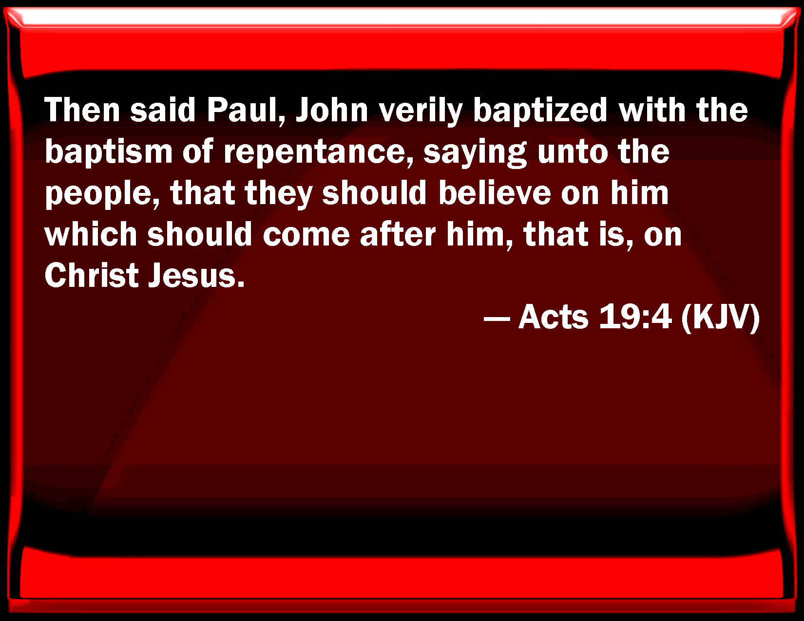 Bible Verse Slide Acts 19:4 Then said Paul, John truly baptized with the baptism of repentance, saying to the people, that they should believe on him which should come after him, that is, on Christ Jesus. KJV: Then said Paul, John verily baptized with the baptism of repentance, saying unto the people, that they should believe on him which should come after him, that is, on Christ Jesus. DRB: Then Paul said: John baptized the people with the baptism of penance, saying: That they should believe in him who was to come after him, that is to say, in Jesus. DBT: And Paul said, John indeed baptised with the baptism of repentance, saying to the people that they should believe on him that was coming after him, that is, on Jesus. ERV: And Paul said, John baptized with the baptism of repentance, saying unto the people, that they should believe on him which should come after him, that is, on Jesus. WBT: Then said Paul, John verily baptized with the baptism of repentance, saying to the people, That they should believe on him who should come after him, that is, on Christ Jesus. WEB: Paul said, "John indeed baptized with the baptism of repentance, saying to the people that they should believe in the one who would come after him, that is, in Jesus." YLT: And Paul said, 'John, indeed, did baptize with a baptism of reformation, saying to the people that in him who is coming after him they should believe — that is, in the Christ — Jesus;'Links Acts 19:4 NIV • Acts 19:4 NLT • Acts 19:4 ESV • Acts 19:4 NASB • Acts 19:4 KJV • Acts 19:4 Interlinear • Acts 19:4 Commentaries • Acts 19:4 Parallel Texts • Acts 19:4 Bible Apps • Acts 19:4 Parallel • Bible Hub |