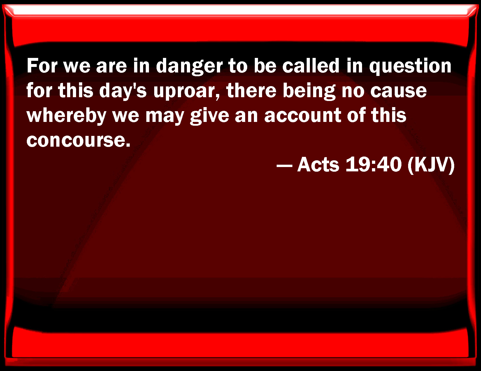 Acts 19:40 For we are in danger to be called in question for this day's uproar, there being no cause whereby we may give an account of this concourse.