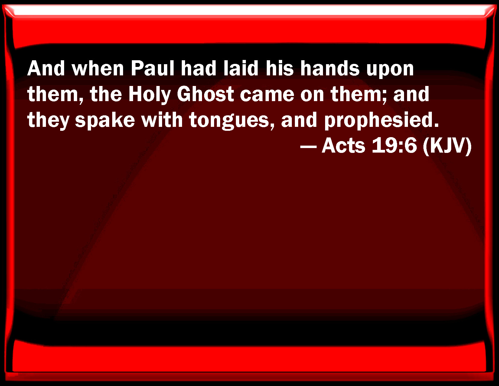 Bible Verse Slide Acts 19:6 And when Paul had laid his hands on them, the Holy Ghost came on them; and they spoke with tongues, and prophesied. KJV: And when Paul had laid his hands upon them, the Holy Ghost came on them; and they spake with tongues, and prophesied. DRB: And when Paul had imposed his hands on them, the Holy Ghost came upon them, and they spoke with tongues and prophesied. DBT: And Paul having laid his hands on them, the Holy Spirit came upon them, and they spoke with tongues and prophesied. ERV: And when Paul had laid his hands upon them, the Holy Ghost came on them; and they spake with tongues, and prophesied. WBT: And when Paul had laid his hands upon them, the Holy Spirit came on them; and they spoke in languages, and prophesied. WEB: When Paul had laid his hands on them, the Holy Spirit came on them, and they spoke with other languages and prophesied. YLT: and Paul having laid on them his hands, the Holy Spirit came upon them, they were speaking also with tongues, and prophesying,Links Acts 19:6 NIV • Acts 19:6 NLT • Acts 19:6 ESV • Acts 19:6 NASB • Acts 19:6 KJV • Acts 19:6 Interlinear • Acts 19:6 Commentaries • Acts 19:6 Parallel Texts • Acts 19:6 Bible Apps • Acts 19:6 Parallel • Bible Hub |