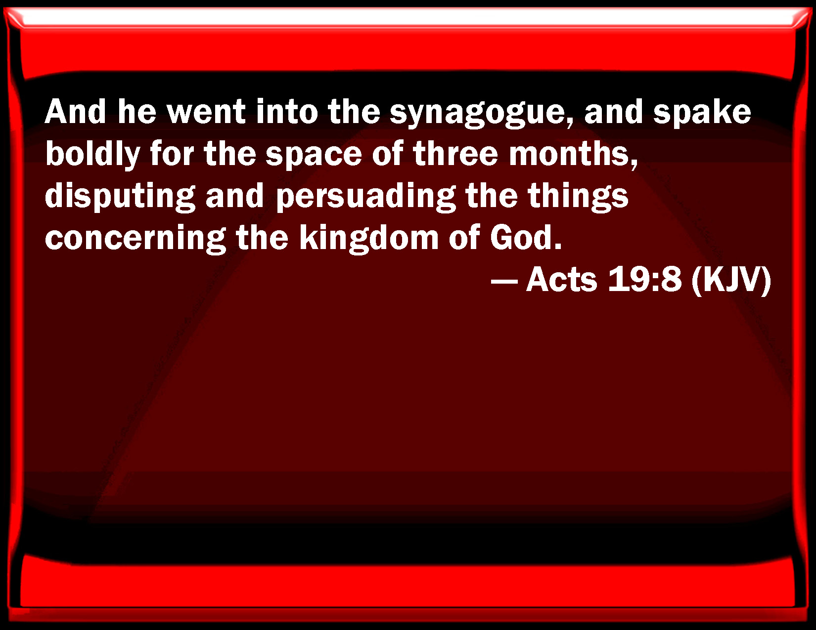 Bible Verse Slide Acts 19:8 And he went into the synagogue, and spoke boldly for the space of three months, disputing and persuading the things concerning the kingdom of God. KJV: And he went into the synagogue, and spake boldly for the space of three months, disputing and persuading the things concerning the kingdom of God. DRB: And entering into the synagogue, he spoke boldly for the space of three months, disputing and exhorting concerning the kingdom of God. DBT: And entering into the synagogue, he spoke boldly during three months, reasoning and persuading the things concerning the kingdom of God. ERV: And he entered into the synagogue, and spake boldly for the space of three months, reasoning and persuading as to the things concerning the kingdom of God. WBT: And he went into the synagogue, and spoke boldly for the space of three months, disputing and persuading the things concerning the kingdom of God. WEB: He entered into the synagogue, and spoke boldly for a period of three months, reasoning and persuading about the things concerning the Kingdom of God. YLT: And having gone into the synagogue, he was speaking boldly for three months, reasoning and persuading the things concerning the reign of God,Links Acts 19:8 NIV • Acts 19:8 NLT • Acts 19:8 ESV • Acts 19:8 NASB • Acts 19:8 KJV • Acts 19:8 Interlinear • Acts 19:8 Commentaries • Acts 19:8 Parallel Texts • Acts 19:8 Bible Apps • Acts 19:8 Parallel • Bible Hub |