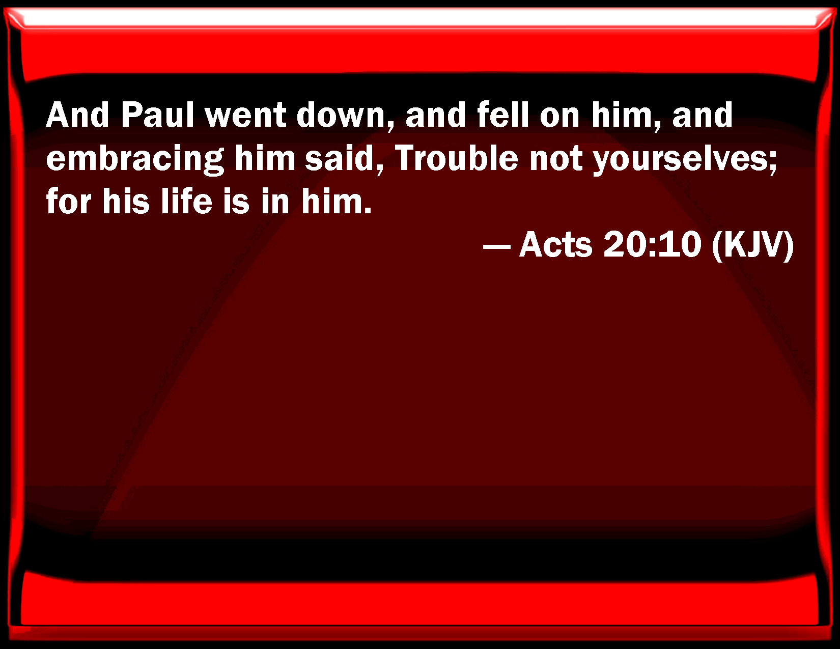 Bible Verse Slide Acts 20:10 And Paul went down, and fell on him, and embracing him said, Trouble not yourselves; for his life is in him. KJV: And Paul went down, and fell on him, and embracing him said, Trouble not yourselves; for his life is in him. DRB: To whom, when Paul had gone down, he laid himself upon him, and embracing him, said: Be not troubled, for his soul is in him. DBT: But Paul descending fell upon him, and enfolding him in his arms, said, Be not troubled, for his life is in him. ERV: And Paul went down, and fell on him, and embracing him said, Make ye no ado; for his life is in him. WBT: And Paul went down, and fell on him, and embracing him, said, Trouble not yourselves; for his life is in him. WEB: Paul went down, and fell upon him, and embracing him said, "Don't be troubled, for his life is in him." YLT: And Paul, having gone down, fell upon him, and having embraced him, said, 'Make no tumult, for his life is in him;'Links Acts 20:10 NIV • Acts 20:10 NLT • Acts 20:10 ESV • Acts 20:10 NASB • Acts 20:10 KJV • Acts 20:10 Interlinear • Acts 20:10 Commentaries • Acts 20:10 Parallel Texts • Acts 20:10 Bible Apps • Acts 20:10 Parallel • Bible Hub |
