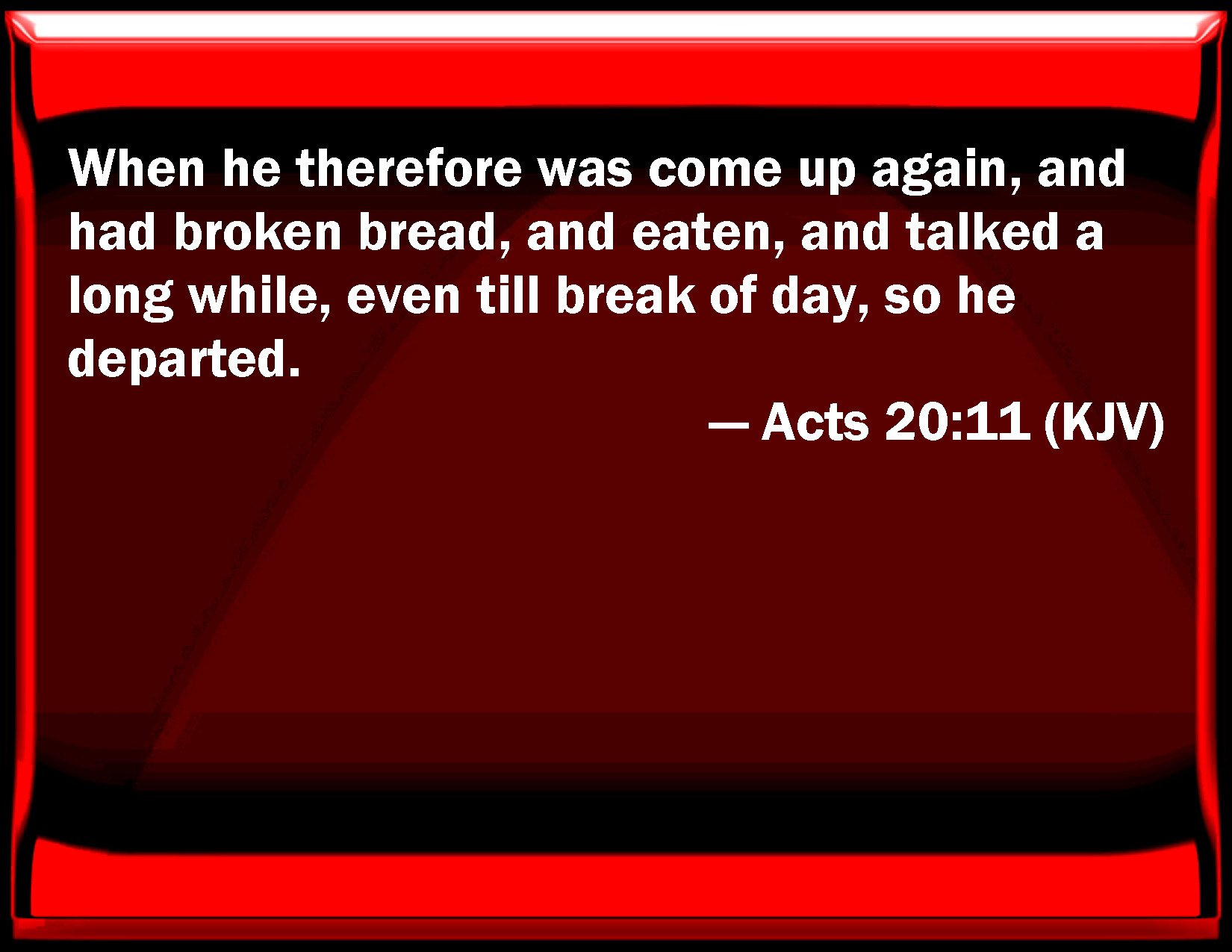 Bible Verse Slide Acts 20:11 When he therefore was come up again, and had broken bread, and eaten, and talked a long while, even till break of day, so he departed. KJV: When he therefore was come up again, and had broken bread, and eaten, and talked a long while, even till break of day, so he departed. DRB: Then going up, and breaking bread and tasting, and having talked a long time to them, until daylight, so he departed. DBT: And having gone up, and having broken the bread, and eaten, and having long spoken until daybreak, so he went away. ERV: And when he was gone up, and had broken the bread, and eaten, and had talked with them a long while, even till break of day, so he departed. WBT: When he had come up again, and had broken bread, and eaten, and discoursed a long while, even till break of day, so he departed. WEB: When he had gone up, and had broken bread, and eaten, and had talked with them a long while, even until break of day, he departed. YLT: and having come up, and having broken bread, and having tasted, for a long time also having talked — till daylight, so he went forth,Links Acts 20:11 NIV • Acts 20:11 NLT • Acts 20:11 ESV • Acts 20:11 NASB • Acts 20:11 KJV • Acts 20:11 Interlinear • Acts 20:11 Commentaries • Acts 20:11 Parallel Texts • Acts 20:11 Bible Apps • Acts 20:11 Parallel • Bible Hub |