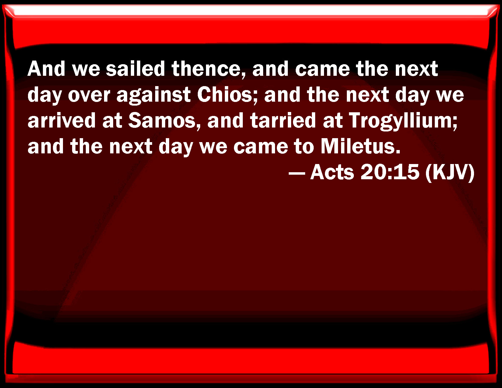 Bible Verse Slide Acts 20:15 And we sailed there, and came the next day over against Chios; and the next day we arrived at Samos, and tarried at Trogyllium; and the next day we came to Miletus. KJV: And we sailed thence, and came the next day over against Chios; and the next day we arrived at Samos, and tarried at Trogyllium; and the next day we came to Miletus. DRB: And sailing thence, the day following we came over against Chios; and the next day we arrived at Samos; and the day following we came to Miletus. DBT: and having sailed thence, on the morrow arrived opposite Chios, and the next day put in at Samos; and having stayed at Trogyllium, the next day we came to Miletus: ERV: And sailing from thence, we came the following day over against Chios; and the next day we touched at Samos; and the day after we came to Miletus. WBT: And we sailed thence, and came the next day over against Chios; and the next day we arrived at Samos, and tarried at Trogyllium; and the next day we came to Miletus. WEB: Sailing from there, we came the following day opposite Chios. The next day we touched at Samos and stayed at Trogyllium, and the day after we came to Miletus. YLT: and thence having sailed, on the morrow we came over-against Chios, and the next day we arrived at Samos, and having remained in Trogyllium, on the following day we came to Miletus,Links Acts 20:15 NIV • Acts 20:15 NLT • Acts 20:15 ESV • Acts 20:15 NASB • Acts 20:15 KJV • Acts 20:15 Interlinear • Acts 20:15 Commentaries • Acts 20:15 Parallel Texts • Acts 20:15 Bible Apps • Acts 20:15 Parallel • Bible Hub |