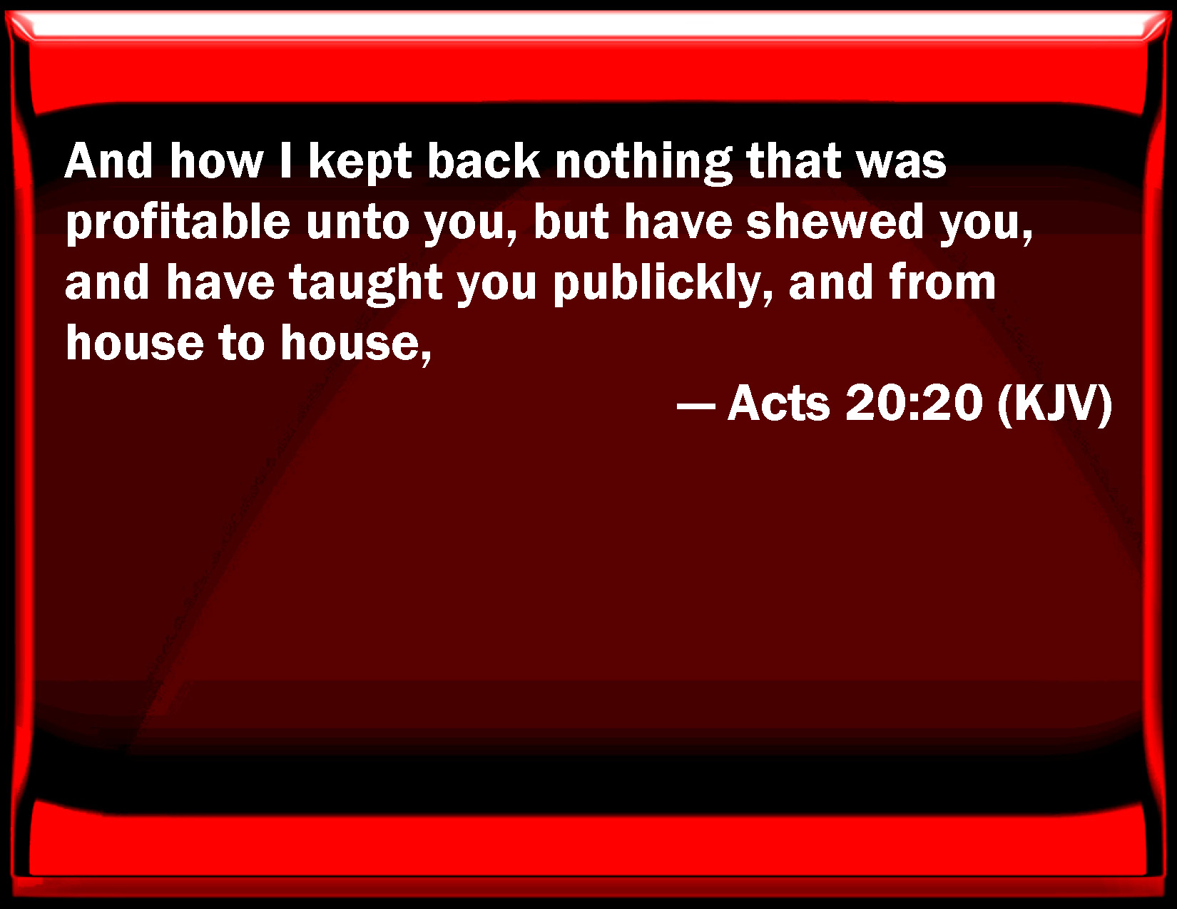 Bible Verse Slide Acts 20:20 And how I kept back nothing that was profitable to you, but have showed you, and have taught you publicly, and from house to house, KJV: And how I kept back nothing that was profitable unto you, but have shewed you, and have taught you publickly, and from house to house, DRB: How I have kept back nothing that was profitable to you, but have preached it to you, and taught you publicly, and from house to house, DBT: how I held back nothing of what is profitable, so as not to announce it to you, and to teach you publicly and in every house, ERV: how that I shrank not from declaring unto you anything that was profitable, and teaching you publicly, and from house to house, WBT: And how I kept back nothing that was profitable to you, but have shown you, and have taught you publicly, and from house to house, WEB: how I didn't shrink from declaring to you anything that was profitable, teaching you publicly and from house to house, YLT: how nothing I did keep back of what things are profitable, not to declare to you, and to teach you publicly, and in every house,Links Acts 20:20 NIV • Acts 20:20 NLT • Acts 20:20 ESV • Acts 20:20 NASB • Acts 20:20 KJV • Acts 20:20 Interlinear • Acts 20:20 Commentaries • Acts 20:20 Parallel Texts • Acts 20:20 Bible Apps • Acts 20:20 Parallel • Bible Hub |