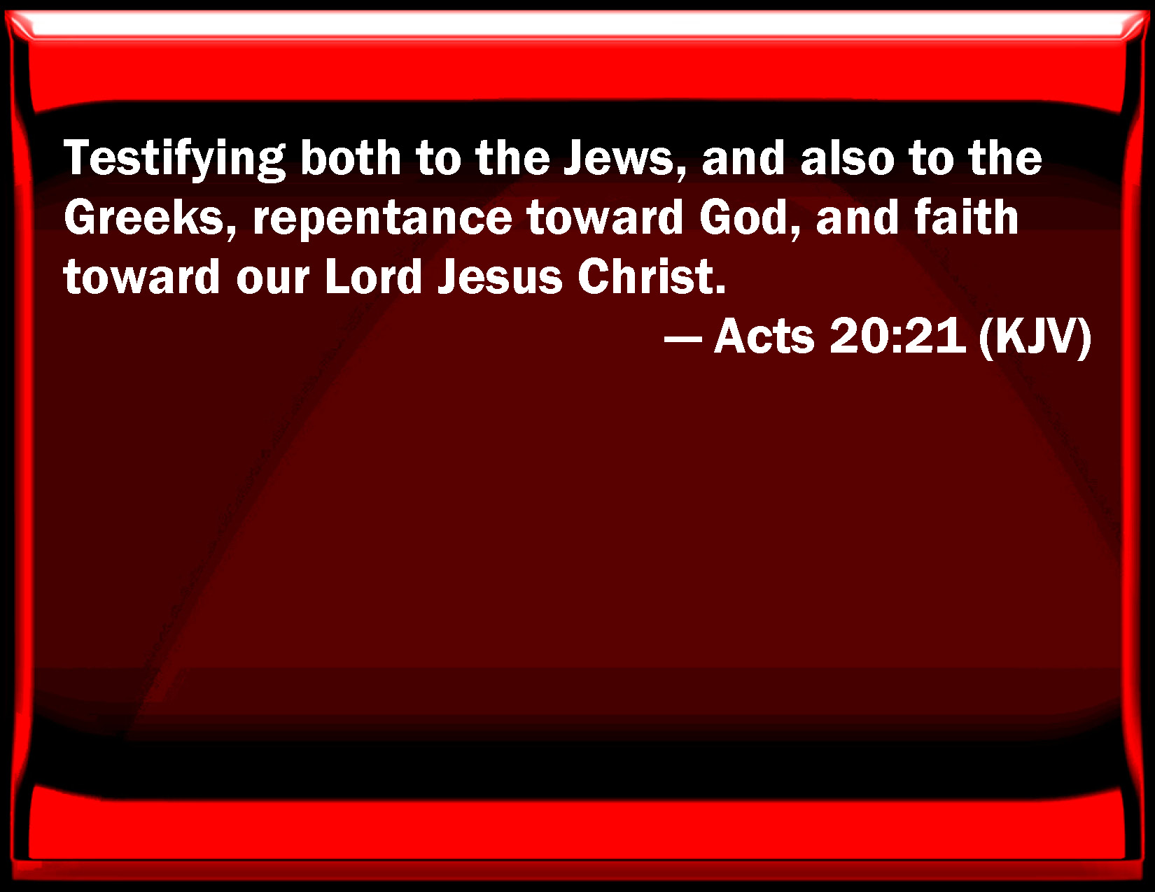 Bible Verse Slide Acts 20:21 Testifying both to the Jews, and also to the Greeks, repentance toward God, and faith toward our Lord Jesus Christ. KJV: Testifying both to the Jews, and also to the Greeks, repentance toward God, and faith toward our Lord Jesus Christ. DRB: Testifying both to Jews and Gentiles penance towards God, and faith in our Lord Jesus Christ. DBT: testifying to both Jews and Greeks repentance towards God, and faith towards our Lord Jesus Christ. ERV: testifying both to Jews and to Greeks repentance toward God, and faith toward our Lord Jesus Christ. WBT: Testifying both to the Jews, and also to the Greeks, repentance towards God, and faith towards our Lord Jesus Christ. WEB: testifying both to Jews and to Greeks repentance toward God, and faith toward our Lord Jesus. YLT: testifying fully both to Jews and Greeks, toward God reformation, and faith toward our Lord Jesus Christ.Links Acts 20:21 NIV • Acts 20:21 NLT • Acts 20:21 ESV • Acts 20:21 NASB • Acts 20:21 KJV • Acts 20:21 Interlinear • Acts 20:21 Commentaries • Acts 20:21 Parallel Texts • Acts 20:21 Bible Apps • Acts 20:21 Parallel • Bible Hub |