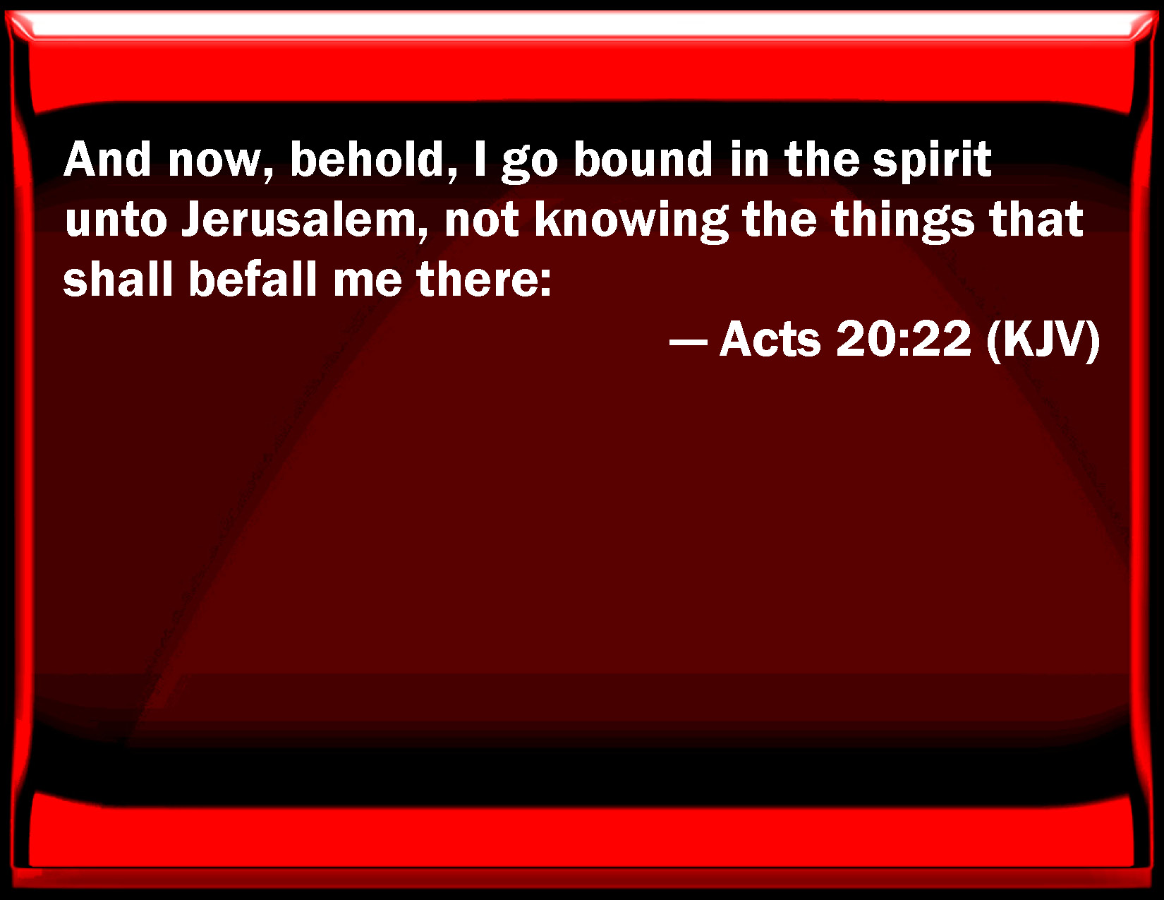 Bible Verse Slide Acts 20:22 And now, behold, I go bound in the spirit to Jerusalem, not knowing the things that shall befall me there: KJV: And now, behold, I go bound in the spirit unto Jerusalem, not knowing the things that shall befall me there: DRB: And now, behold, being bound in the spirit, I go to Jerusalem: not knowing the things which shall befall me there: DBT: And now, behold, bound in my spirit I go to Jerusalem, not knowing what things shall happen to me in it; ERV: And now, behold, I go bound in the spirit unto Jerusalem, not knowing the things that shall befall me there: WBT: And now behold, I go bound in the spirit to Jerusalem, not knowing the things that shall befall me there: WEB: Now, behold, I go bound by the Spirit to Jerusalem, not knowing what will happen to me there; YLT: And now, lo, I — bound in the Spirit — go on to Jerusalem, the things that shall befall me in it not knowing,Links Acts 20:22 NIV • Acts 20:22 NLT • Acts 20:22 ESV • Acts 20:22 NASB • Acts 20:22 KJV • Acts 20:22 Interlinear • Acts 20:22 Commentaries • Acts 20:22 Parallel Texts • Acts 20:22 Bible Apps • Acts 20:22 Parallel • Bible Hub |