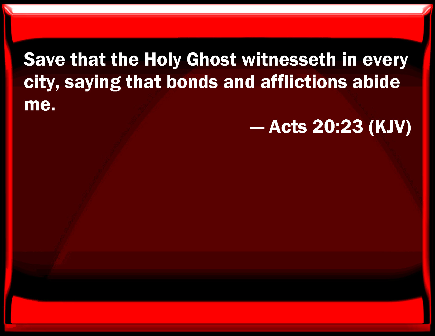 Bible Verse Slide Acts 20:23 Save that the Holy Ghost witnesses in every city, saying that bonds and afflictions abide me. KJV: Save that the Holy Ghost witnesseth in every city, saying that bonds and afflictions abide me. DRB: Save that the Holy Ghost in every city witnesseth to me, saying: That bands and afflictions wait for me at Jerusalem. DBT: only that the Holy Spirit testifies to me in every city, saying that bonds and tribulations await me. ERV: save that the Holy Ghost testifieth unto me in every city, saying that bonds and afflictions abide me. WBT: Save that the Holy Spirit testifieth in every city, saying, that bonds and afflictions abide me. WEB: except that the Holy Spirit testifies in every city, saying that bonds and afflictions wait for me. YLT: save that the Holy Spirit in every city doth testify fully, saying, that for me bonds and tribulations remain;Links Acts 20:23 NIV • Acts 20:23 NLT • Acts 20:23 ESV • Acts 20:23 NASB • Acts 20:23 KJV • Acts 20:23 Interlinear • Acts 20:23 Commentaries • Acts 20:23 Parallel Texts • Acts 20:23 Bible Apps • Acts 20:23 Parallel • Bible Hub |