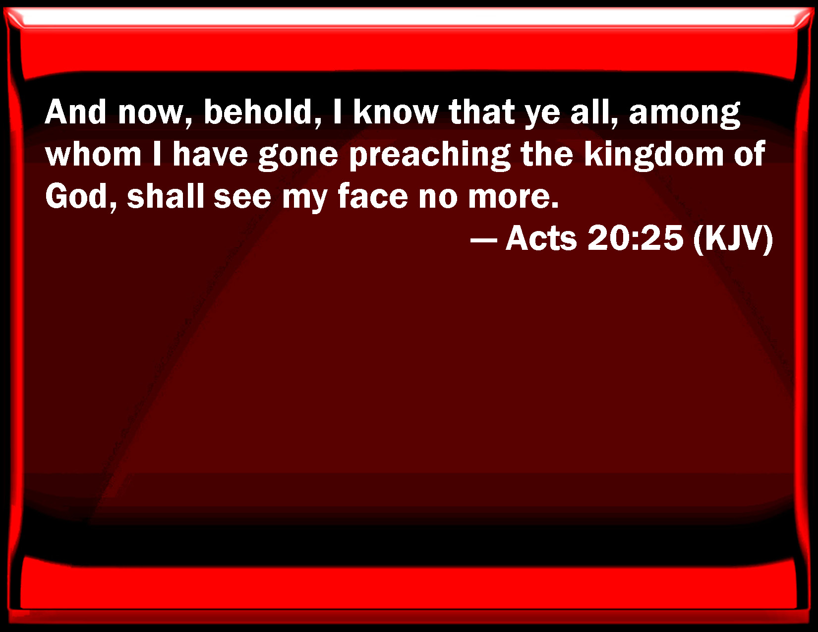 Bible Verse Slide Acts 20:25 And now, behold, I know that you all, among whom I have gone preaching the kingdom of God, shall see my face no more. KJV: And now, behold, I know that ye all, among whom I have gone preaching the kingdom of God, shall see my face no more. DRB: And now behold, I know that all you, among whom I have gone preaching the kingdom of God, shall see my face no more. DBT: And now, behold, I know that ye all, among whom I have gone about preaching the kingdom of God, shall see my face no more. ERV: And now, behold, I know that ye all, among whom I went about preaching the kingdom, shall see my face no more. WBT: And now behold, I know that ye all, among whom I have gone preaching the kingdom of God, will see my face no more. WEB: "Now, behold, I know that you all, among whom I went about preaching the Kingdom of God, will see my face no more. YLT: And now, lo, I have known that no more shall ye see my face, — ye all among whom I did go preaching the reign of God;Links Acts 20:25 NIV • Acts 20:25 NLT • Acts 20:25 ESV • Acts 20:25 NASB • Acts 20:25 KJV • Acts 20:25 Interlinear • Acts 20:25 Commentaries • Acts 20:25 Parallel Texts • Acts 20:25 Bible Apps • Acts 20:25 Parallel • Bible Hub |