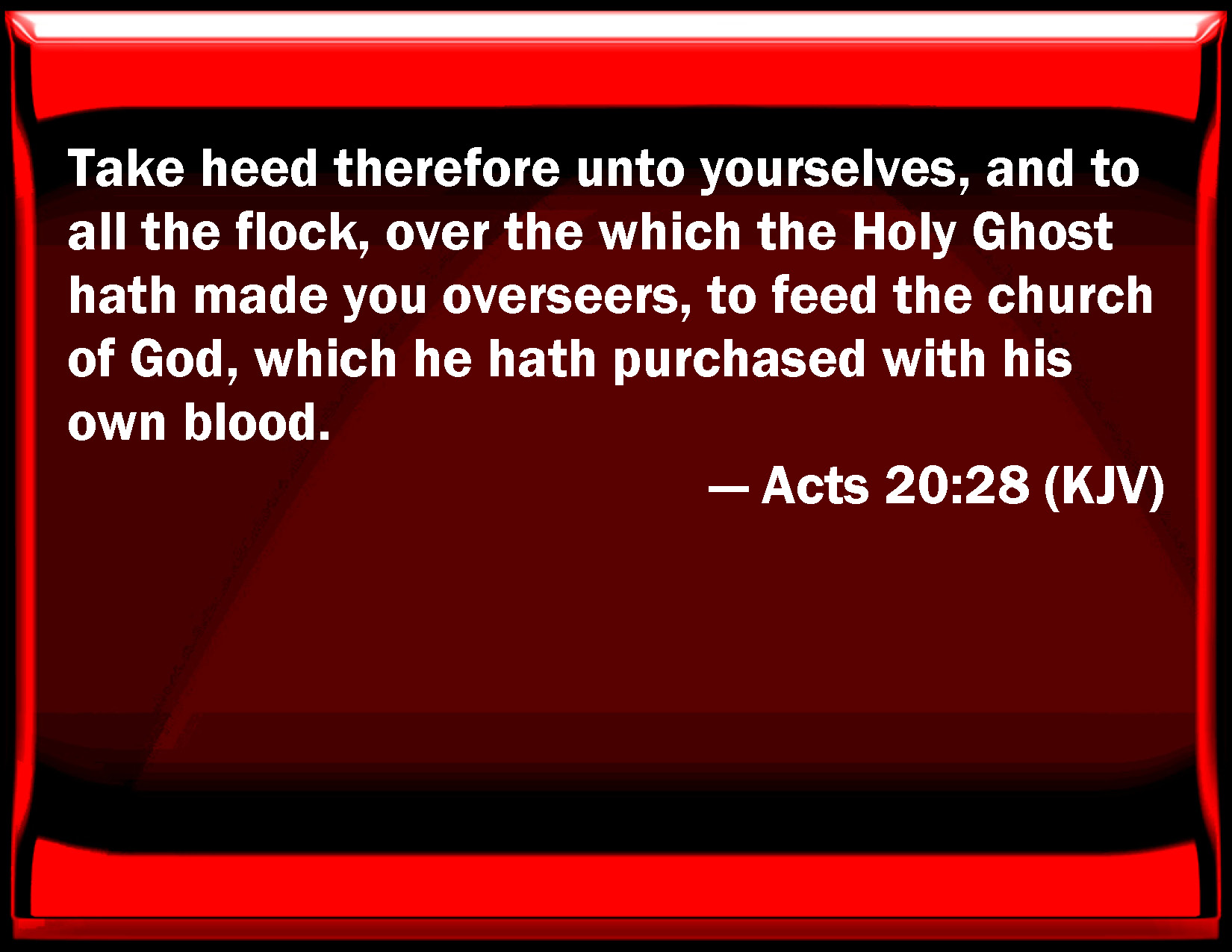 Bible Verse Slide Acts 20:28 Take heed therefore to yourselves, and to all the flock, over the which the Holy Ghost has made you overseers, to feed the church of God, which he has purchased with his own blood. KJV: Take heed therefore unto yourselves, and to all the flock, over the which the Holy Ghost hath made you overseers, to feed the church of God, which he hath purchased with his own blood. DRB: Take heed to yourselves, and to the whole flock, wherein the Holy Ghost hath placed you bishops, to rule the church of God, which he hath purchased with his own blood. DBT: Take heed therefore to yourselves, and to all the flock, wherein the Holy Spirit has set you as overseers, to shepherd the assembly of God, which he has purchased with the blood of his own. ERV: Take heed unto yourselves, and to all the flock, in the which the Holy Ghost hath made you bishops, to feed the church of God, which he purchased with his own blood. WBT: Take heed therefore to yourselves, and to all the flock over which the Holy Spirit hath made you overseers, to feed the church of God, which he hath purchased with his own blood. WEB: Take heed, therefore, to yourselves, and to all the flock, in which the Holy Spirit has made you overseers, to shepherd the assembly of the Lord and God which he purchased with his own blood. YLT: 'Take heed, therefore, to yourselves, and to all the flock, among which the Holy Spirit made you overseers, to feed the assembly of God that He acquired through His own blood,Links Acts 20:28 NIV • Acts 20:28 NLT • Acts 20:28 ESV • Acts 20:28 NASB • Acts 20:28 KJV • Acts 20:28 Interlinear • Acts 20:28 Commentaries • Acts 20:28 Parallel Texts • Acts 20:28 Bible Apps • Acts 20:28 Parallel • Bible Hub |
