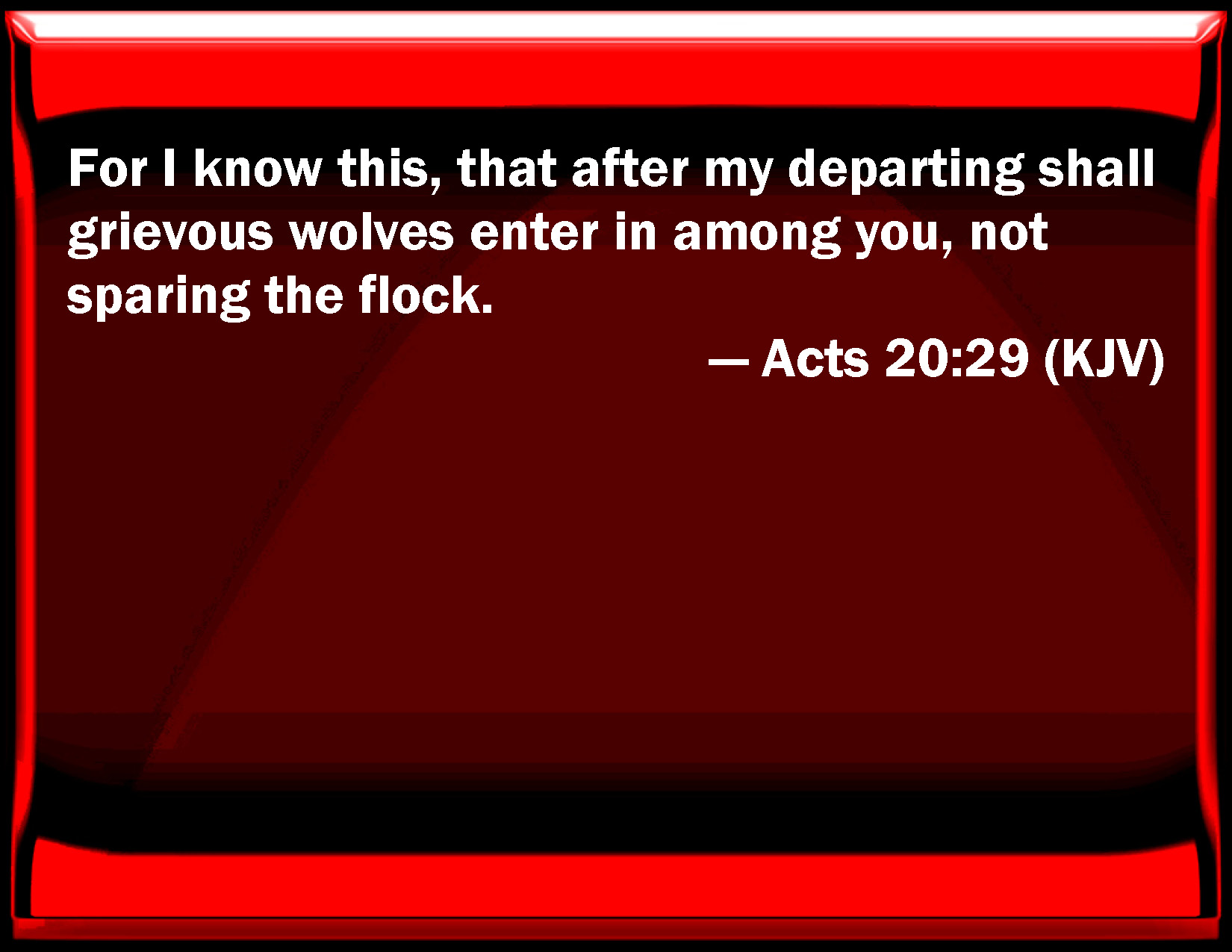 Bible Verse Slide Acts 20:29 For I know this, that after my departing shall grievous wolves enter in among you, not sparing the flock. KJV: For I know this, that after my departing shall grievous wolves enter in among you, not sparing the flock. DRB: I know that, after my departure, ravening wolves will enter in among you, not sparing the flock. DBT: For I know this, that there will come in amongst you after my departure grievous wolves, not sparing the flock; ERV: I know that after my departing grievous wolves shall enter in among you, not sparing the flock; WBT: For I know this, that after my departure grievous wolves will enter in among you, not sparing the flock. WEB: For I know that after my departure, vicious wolves will enter in among you, not sparing the flock. YLT: for I have known this, that there shall enter in, after my departing, grievous wolves unto you, not sparing the flock,Links Acts 20:29 NIV • Acts 20:29 NLT • Acts 20:29 ESV • Acts 20:29 NASB • Acts 20:29 KJV • Acts 20:29 Interlinear • Acts 20:29 Commentaries • Acts 20:29 Parallel Texts • Acts 20:29 Bible Apps • Acts 20:29 Parallel • Bible Hub |
