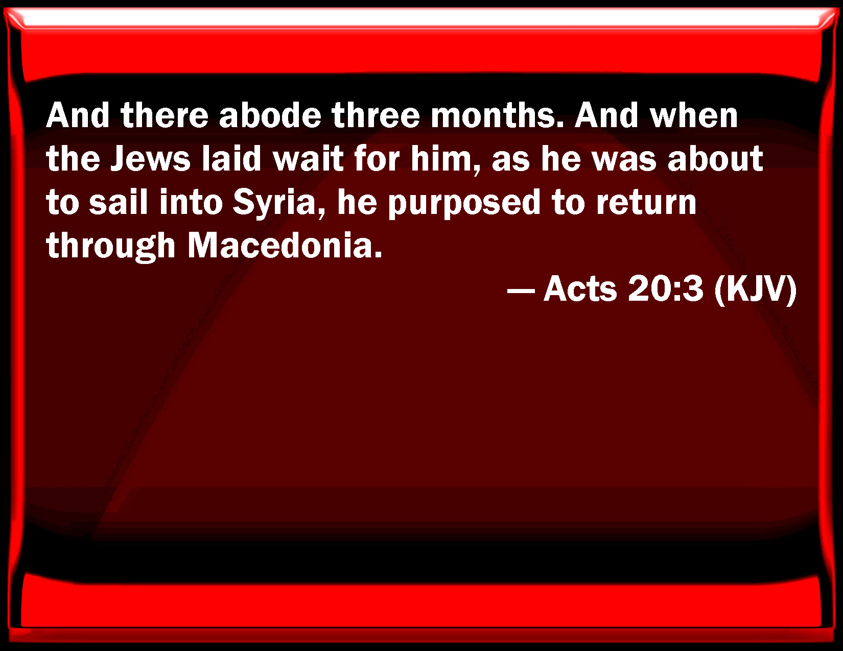 Bible Verse Slide Acts 20:3 And there stayed three months. And when the Jews laid wait for him, as he was about to sail into Syria, he purposed to return through Macedonia. KJV: And there abode three months. And when the Jews laid wait for him, as he was about to sail into Syria, he purposed to return through Macedonia. DRB: Where, when he had spent three months, the Jews laid wait for him, as he was about to sail into Syria; so he took a resolution to return through Macedonia. DBT: And having spent three months there, a treacherous plot against him having been set on foot by the Jews, as he was going to sail to Syria, the resolution was adopted of returning through Macedonia. ERV: And when he had spent three months there, and a plot was laid against him by the Jews, as he was about to set sail for Syria, he determined to return through Macedonia. WBT: And there abode three months. And when the Jews laid wait for him, as he was about to sail into Syria, he purposed to return through Macedonia. WEB: When he had spent three months there, and a plot was made against him by Jews as he was about to set sail for Syria, he determined to return through Macedonia. YLT: having made also three months' stay — a counsel of the Jews having been against him — being about to set forth to Syria, there came to him a resolution of returning through Macedonia.Links Acts 20:3 NIV • Acts 20:3 NLT • Acts 20:3 ESV • Acts 20:3 NASB • Acts 20:3 KJV • Acts 20:3 Interlinear • Acts 20:3 Commentaries • Acts 20:3 Parallel Texts • Acts 20:3 Bible Apps • Acts 20:3 Parallel • Bible Hub |