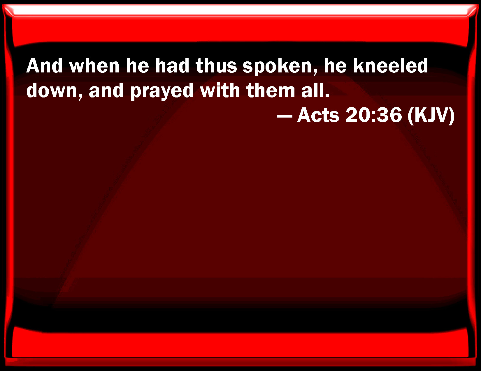 Bible Verse Slide Acts 20:36 And when he had thus spoken, he kneeled down, and prayed with them all. KJV: And when he had thus spoken, he kneeled down, and prayed with them all. DRB: And when he had said these things, kneeling down, he prayed with them all. DBT: And having said these things, he knelt down and prayed with them all. ERV: And when he had thus spoken, he kneeled down, and prayed with them all. WBT: And when he had thus spoken, he kneeled down, and prayed with them all. WEB: When he had spoken these things, he knelt down and prayed with them all. YLT: And these things having said, having bowed his knees, with them all, he did pray,Links Acts 20:36 NIV • Acts 20:36 NLT • Acts 20:36 ESV • Acts 20:36 NASB • Acts 20:36 KJV • Acts 20:36 Interlinear • Acts 20:36 Commentaries • Acts 20:36 Parallel Texts • Acts 20:36 Bible Apps • Acts 20:36 Parallel • Bible Hub |