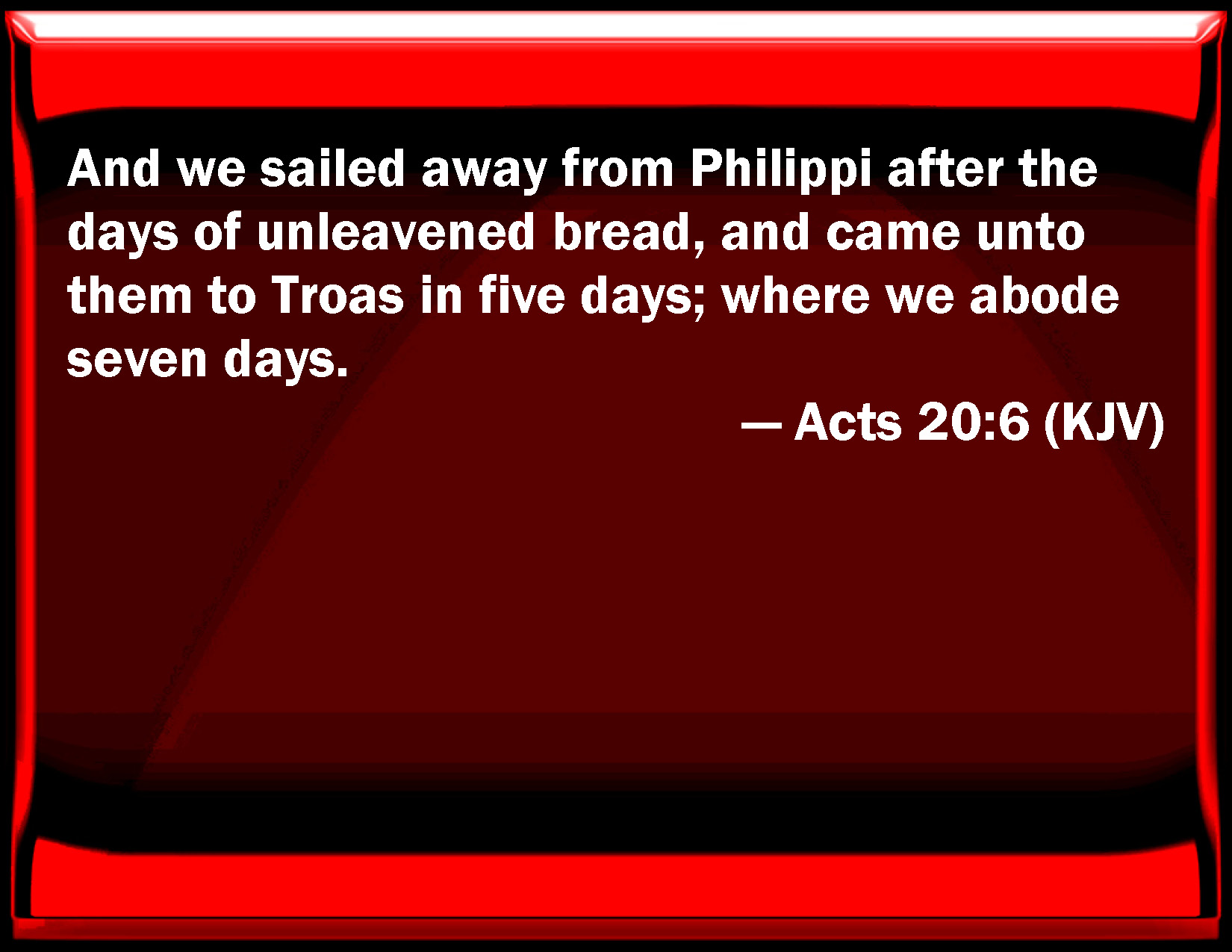 Bible Verse Slide Acts 20:6 And we sailed away from Philippi after the days of unleavened bread, and came to them to Troas in five days; where we stayed seven days. KJV: And we sailed away from Philippi after the days of unleavened bread, and came unto them to Troas in five days; where we abode seven days. DRB: But we sailed from Philippi after the days of the Azymes, and came to them to Troas in five days, where we abode seven days. DBT: but we sailed away from Philippi after the days of unleavened bread, and we came to them to Troas in five days, where we spent seven days. ERV: And we sailed away from Philippi after the days of unleavened bread, and came unto them to Troas in five days; where we tarried seven days. WBT: And we sailed away from Philippi, after the days of unleavened bread, and came to them to Troas in five days; where we abode seven days. WEB: We sailed away from Philippi after the days of Unleavened Bread, and came to them at Troas in five days, where we stayed seven days. YLT: and we sailed, after the days of the unleavened food, from Philippi, and came unto them to Troas in five days, where we abode seven days.Links Acts 20:6 NIV • Acts 20:6 NLT • Acts 20:6 ESV • Acts 20:6 NASB • Acts 20:6 KJV • Acts 20:6 Interlinear • Acts 20:6 Commentaries • Acts 20:6 Parallel Texts • Acts 20:6 Bible Apps • Acts 20:6 Parallel • Bible Hub |