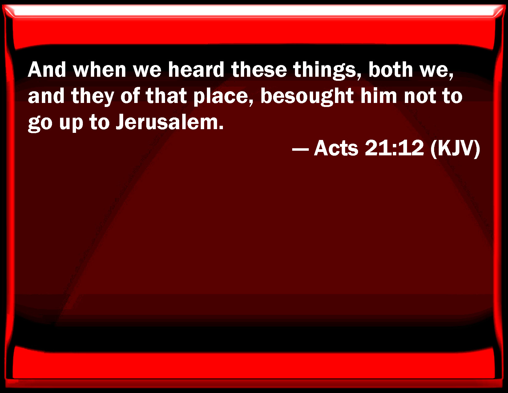 Bible Verse Slide Acts 21:12 And when we heard these things, both we, and they of that place, sought him not to go up to Jerusalem. KJV: And when we heard these things, both we, and they of that place, besought him not to go up to Jerusalem. DRB: Which when we had heard, both we and they that were of that place, desired him that he would not go up to Jerusalem. DBT: And when we heard these things, both we and those of the place besought him not to go up to Jerusalem. ERV: And when we heard these things, both we and they of that place besought him not to go up to Jerusalem. WBT: And when we heard these things, both we, and they of that place, besought him not to go up to Jerusalem. WEB: When we heard these things, both we and they of that place begged him not to go up to Jerusalem. YLT: And when we heard these things, we called upon him — both we, and those of that place — not to go up to Jerusalem,Links Acts 21:12 NIV • Acts 21:12 NLT • Acts 21:12 ESV • Acts 21:12 NASB • Acts 21:12 KJV • Acts 21:12 Interlinear • Acts 21:12 Commentaries • Acts 21:12 Parallel Texts • Acts 21:12 Bible Apps • Acts 21:12 Parallel • Bible Hub |
