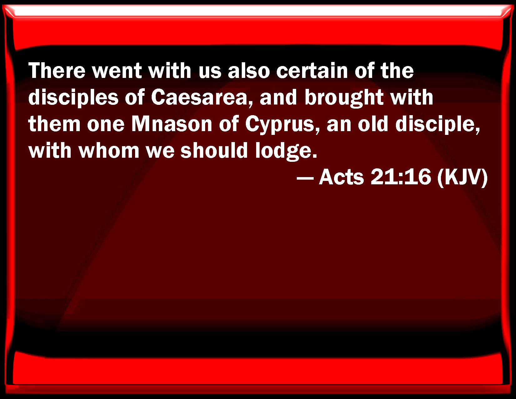 Bible Verse Slide Acts 21:16 There went with us also certain of the disciples of Caesarea, and brought with them one Mnason of Cyprus, an old disciple, with whom we should lodge. KJV: There went with us also certain of the disciples of Caesarea, and brought with them one Mnason of Cyprus, an old disciple, with whom we should lodge. DRB: And there went also with us some of the disciples from Caesarea, bringing with them one Mnason a Cyprian, an old disciple, with whom we should lodge. DBT: And some of the disciples from Caesarea went with us, bringing with them a certain Mnason, a Cyprian, an old disciple, with whom we were to lodge. ERV: And there went with us also certain of the disciples from Caesarea, bringing with them one Mnason of Cyprus, an early disciple, with whom we should lodge. WBT: There went with us also certain of the disciples of Cesarea, and brought with them one Mnason of Cyprus, an old disciple, with whom we should lodge. WEB: Some of the disciples from Caesarea also went with us, bringing one Mnason of Cyprus, an early disciple, with whom we would stay. YLT: and there went also of the disciples from Caesarea with us, bringing with them him with whom we may lodge, a certain Mnason of Cyprus, an aged disciple.Links Acts 21:16 NIV • Acts 21:16 NLT • Acts 21:16 ESV • Acts 21:16 NASB • Acts 21:16 KJV • Acts 21:16 Interlinear • Acts 21:16 Commentaries • Acts 21:16 Parallel Texts • Acts 21:16 Bible Apps • Acts 21:16 Parallel • Bible Hub |