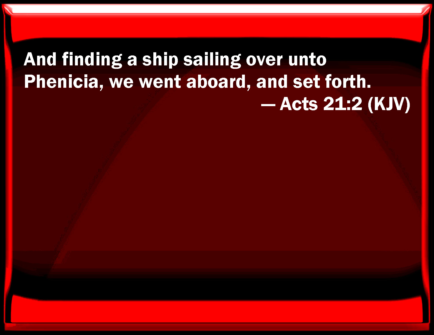 Bible Verse Slide Acts 21:2 And finding a ship sailing over to Phenicia, we went aboard, and set forth. KJV: And finding a ship sailing over unto Phenicia, we went aboard, and set forth. DRB: And when we had found a ship sailing over to Phenice, we went aboard, and set forth. DBT: And having found a ship passing over into Phoenicia, we went on board and sailed; ERV: and having found a ship crossing over unto Phoenicia, we went aboard, and set sail. WBT: And finding a ship sailing over to Phenicia, we went aboard, and set forth. WEB: Having found a ship crossing over to Phoenicia, we went aboard, and set sail. YLT: and having found a ship passing over to Phenicia, having gone on board, we sailed,Links Acts 21:2 NIV • Acts 21:2 NLT • Acts 21:2 ESV • Acts 21:2 NASB • Acts 21:2 KJV • Acts 21:2 Interlinear • Acts 21:2 Commentaries • Acts 21:2 Parallel Texts • Acts 21:2 Bible Apps • Acts 21:2 Parallel • Bible Hub |
