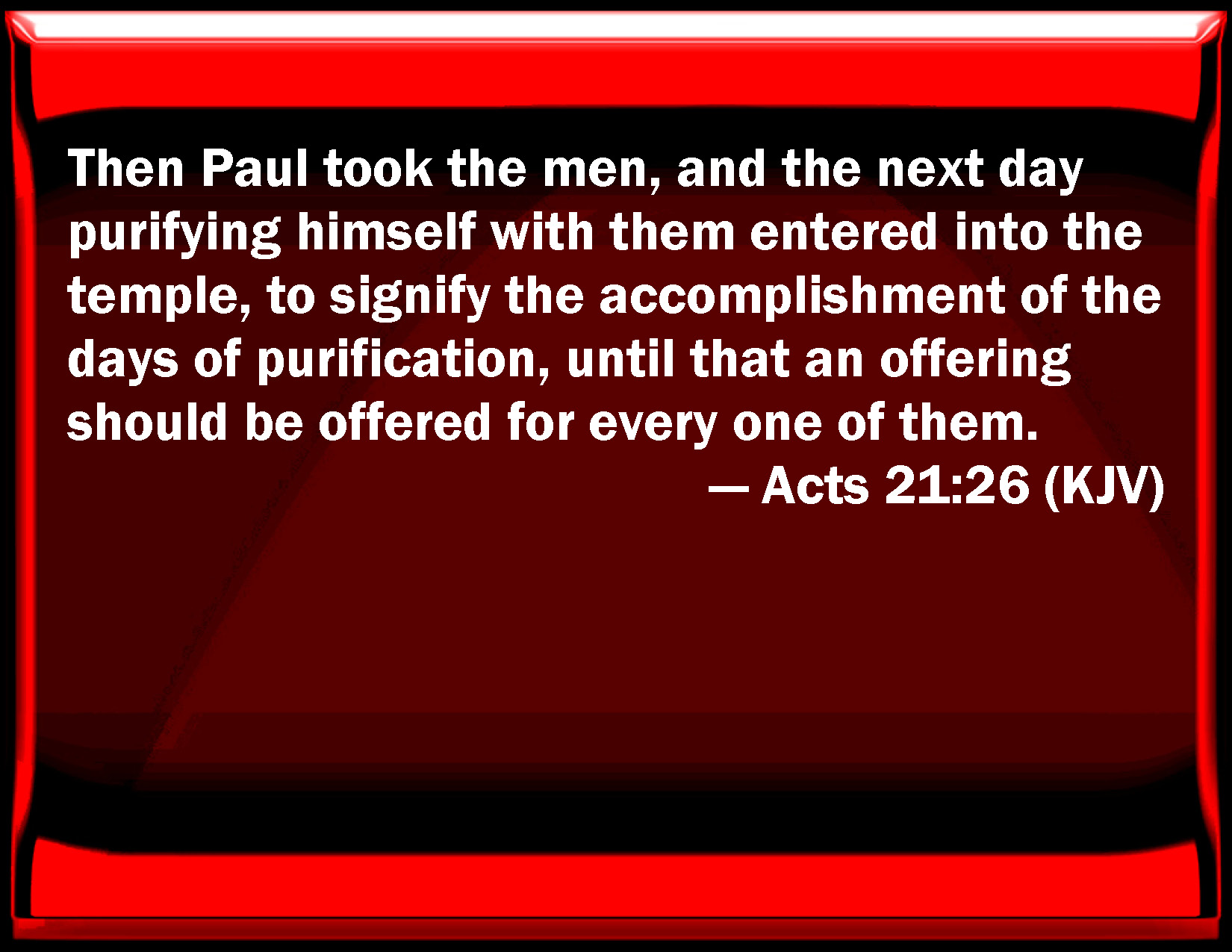 Bible Verse Slide Acts 21:26 Then Paul took the men, and the next day purifying himself with them entered into the temple, to signify the accomplishment of the days of purification, until that an offering should be offered for every one of them. KJV: Then Paul took the men, and the next day purifying himself with them entered into the temple, to signify the accomplishment of the days of purification, until that an offering should be offered for every one of them. DRB: Then Paul took the men, and the next day being purified with them, entered into the temple, giving notice of the accomplishment of the days of purification, until an oblation should be offered for every one of them. DBT: Then Paul, taking the men, on the next day, having been purified, entered with them into the temple, signifying the time the days of the purification would be fulfilled, until the offering was offered for every one of them. ERV: Then Paul took the men, and the next day purifying himself with them went into the temple, declaring the fulfillment of the days of purification, until the offering was offered for every one of them. WBT: Then Paul took the men, and the next day purifying himself with them, entered into the temple, to signify the accomplishment of the days of purification, until an offering should be offered for every one of them. WEB: Then Paul took the men, and the next day, purified himself and went with them into the temple, declaring the fulfillment of the days of purification, until the offering was offered for every one of them. YLT: Then Paul, having taken the men, on the following day, with them having purified himself, was entering into the temple, announcing the fulfilment of the days of the purification, till the offering was offered for each one of them.Links Acts 21:26 NIV • Acts 21:26 NLT • Acts 21:26 ESV • Acts 21:26 NASB • Acts 21:26 KJV • Acts 21:26 Interlinear • Acts 21:26 Commentaries • Acts 21:26 Parallel Texts • Acts 21:26 Bible Apps • Acts 21:26 Parallel • Bible Hub |
